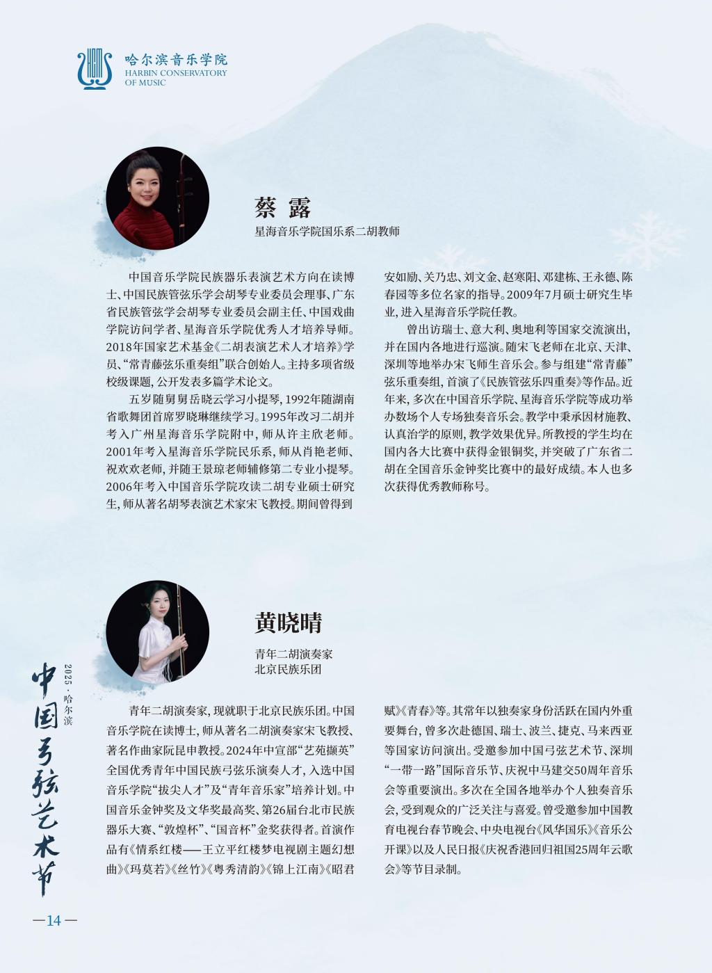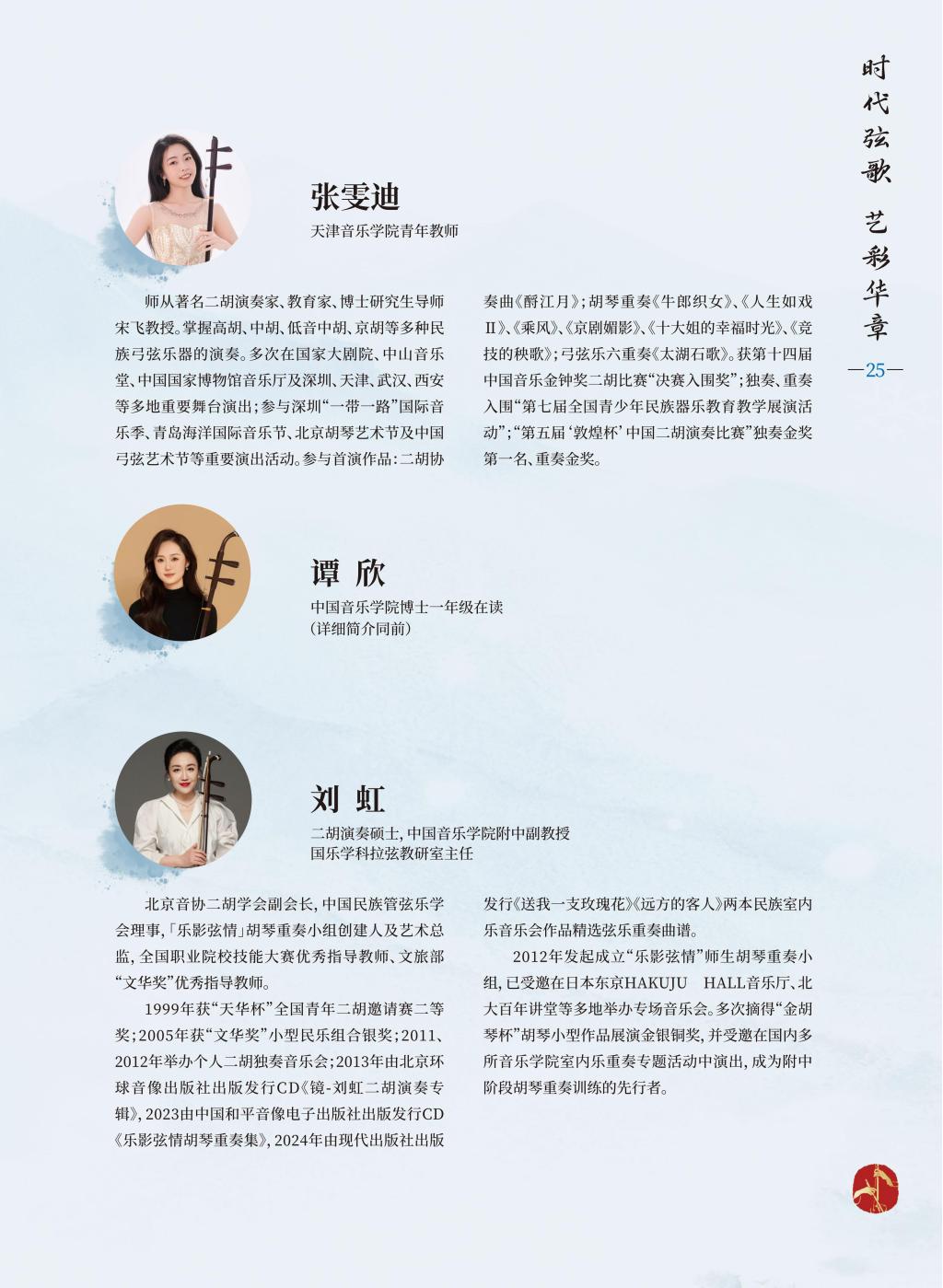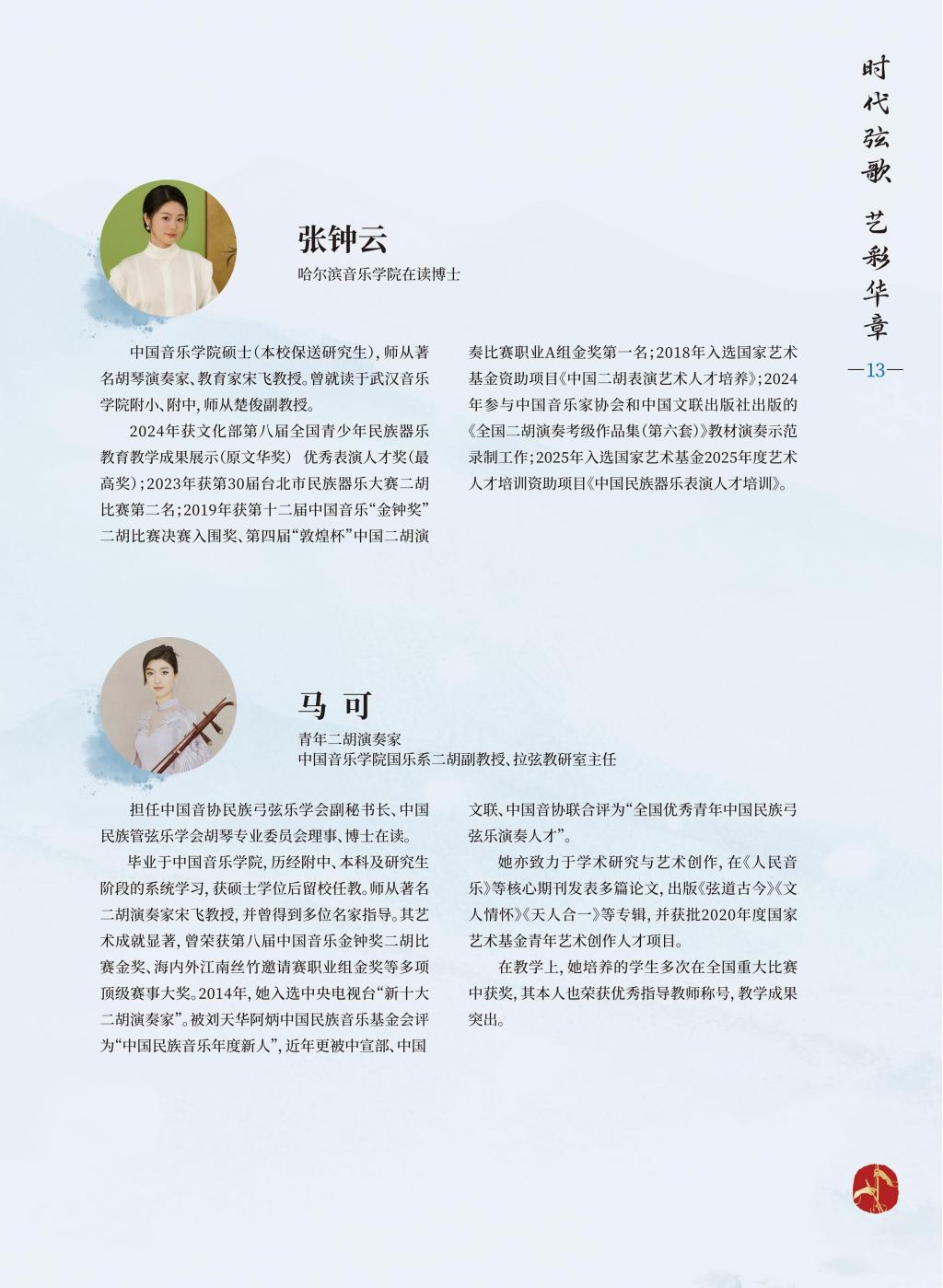 同时,邀请到苏雅和余乐夫分别作题为《内蒙古四胡地域风格及其音乐语汇》和《“亦土亦洋”的当代高胡艺术》的胡琴艺术特色讲座;邀请到梁云江和汝艺开展《二胡演奏的力向与角度》和《孙文明胡琴艺术的特色与创新——以流波曲、杜十娘为例》的二胡教学专题讲座;还邀请王云飞和刘卓夫作《当代二胡作品的创作实践与思考——以我的创作为例》和《浅谈我的二胡创作实践》的二胡创作专题讲座;特别邀请高韶青作二胡教学专题公开课。“面向学科建设的潮涌(2000-2025):新世纪胡琴艺术创演教研的反思”专题研讨会,探讨诸如地域风格溯源、演奏技法应用、经典曲目新解、当代创作探究、舞台艺术的多元发展创新等核心议题,让艺术节不仅获得视听的震撼和享受,并升华为一个激发思想碰撞、凝聚行业共识的高端对话场域。