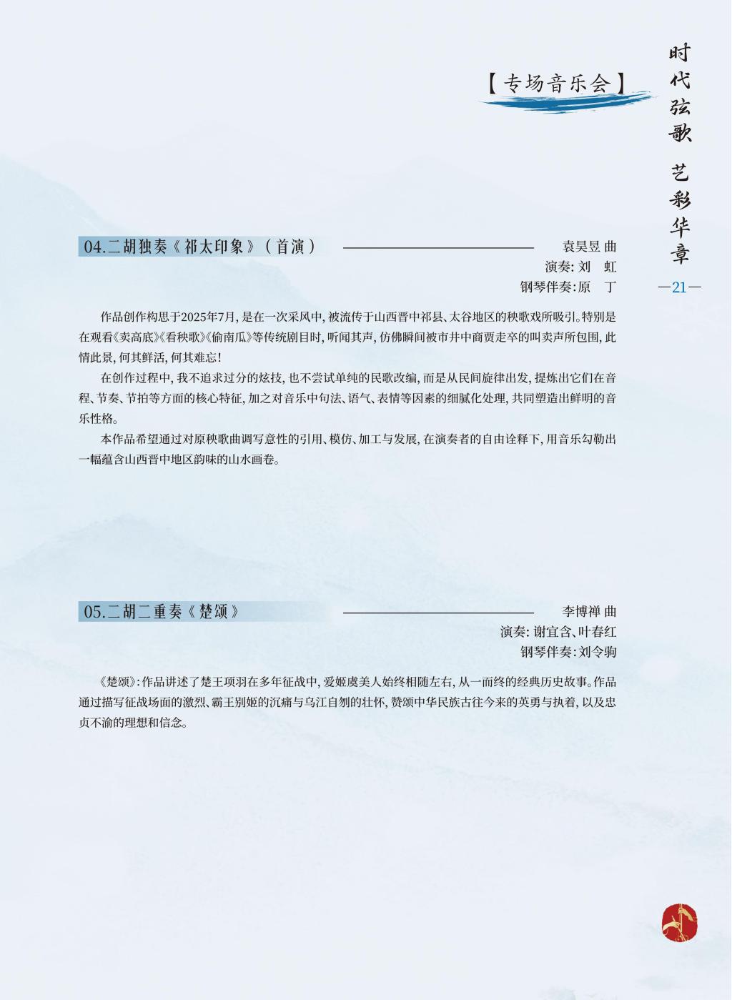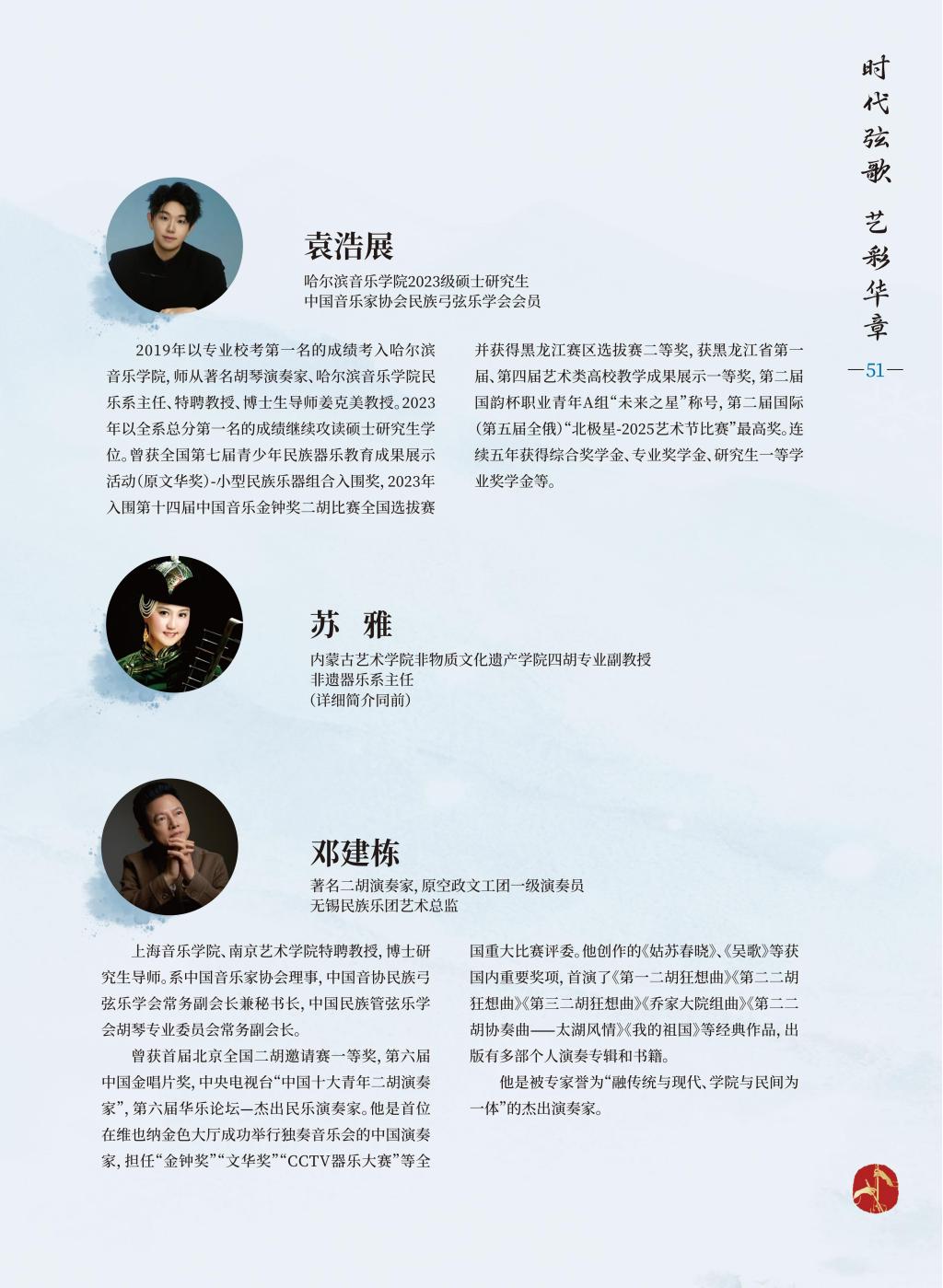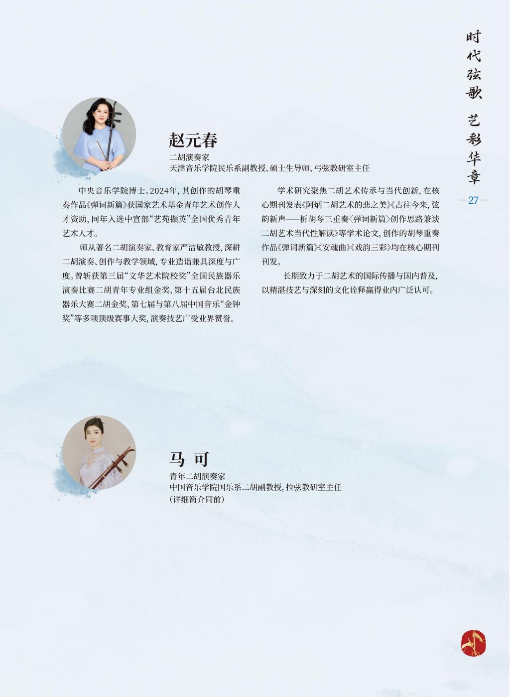 同时,邀请到苏雅和余乐夫分别作题为《内蒙古四胡地域风格及其音乐语汇》和《“亦土亦洋”的当代高胡艺术》的胡琴艺术特色讲座;邀请到梁云江和汝艺开展《二胡演奏的力向与角度》和《孙文明胡琴艺术的特色与创新——以流波曲、杜十娘为例》的二胡教学专题讲座;还邀请王云飞和刘卓夫作《当代二胡作品的创作实践与思考——以我的创作为例》和《浅谈我的二胡创作实践》的二胡创作专题讲座;特别邀请高韶青作二胡教学专题公开课。“面向学科建设的潮涌(2000-2025):新世纪胡琴艺术创演教研的反思”专题研讨会,探讨诸如地域风格溯源、演奏技法应用、经典曲目新解、当代创作探究、舞台艺术的多元发展创新等核心议题,让艺术节不仅获得视听的震撼和享受,并升华为一个激发思想碰撞、凝聚行业共识的高端对话场域。