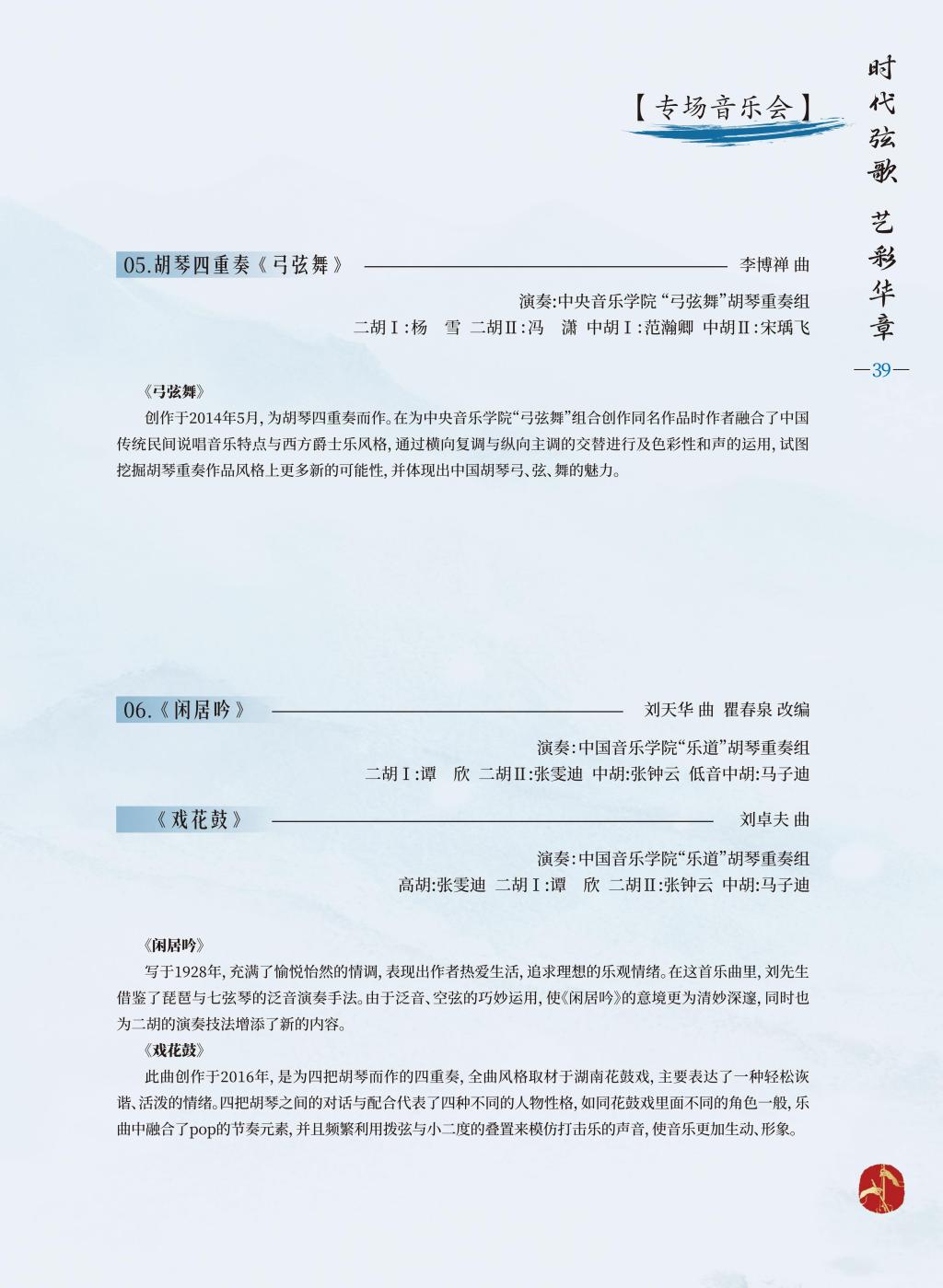 四大主题音乐会构成了艺术节的纵向主轴,开幕音乐会由教育家宋飞教授携其7名博士生带来的“心弦飞扬”宋飞教学成果展示音乐会,展现“薪火相传”的育人成果;由青年二胡演奏家杨雪、刘虹、赵元春、马可等9位优秀的新生代演奏家带来的“弓弦新声”青年二胡演奏家专场音乐会;由中国音乐学院及其附中、中央音乐学院、星海音乐学院、沈阳音乐学院、天津音乐学院等国内音乐院校带来的“弓弦和鸣”胡琴重奏专场音乐会;由著名胡琴演奏家宋飞、邓建栋、姜克美等8位名家携手著名指挥孙敬凯带来的“弓弦华章”民族弓弦乐名家音乐会,在弓弦的交响和鸣中,让我们感受到民族弓弦艺术丰富多彩、富有新的时代气息的魅力。