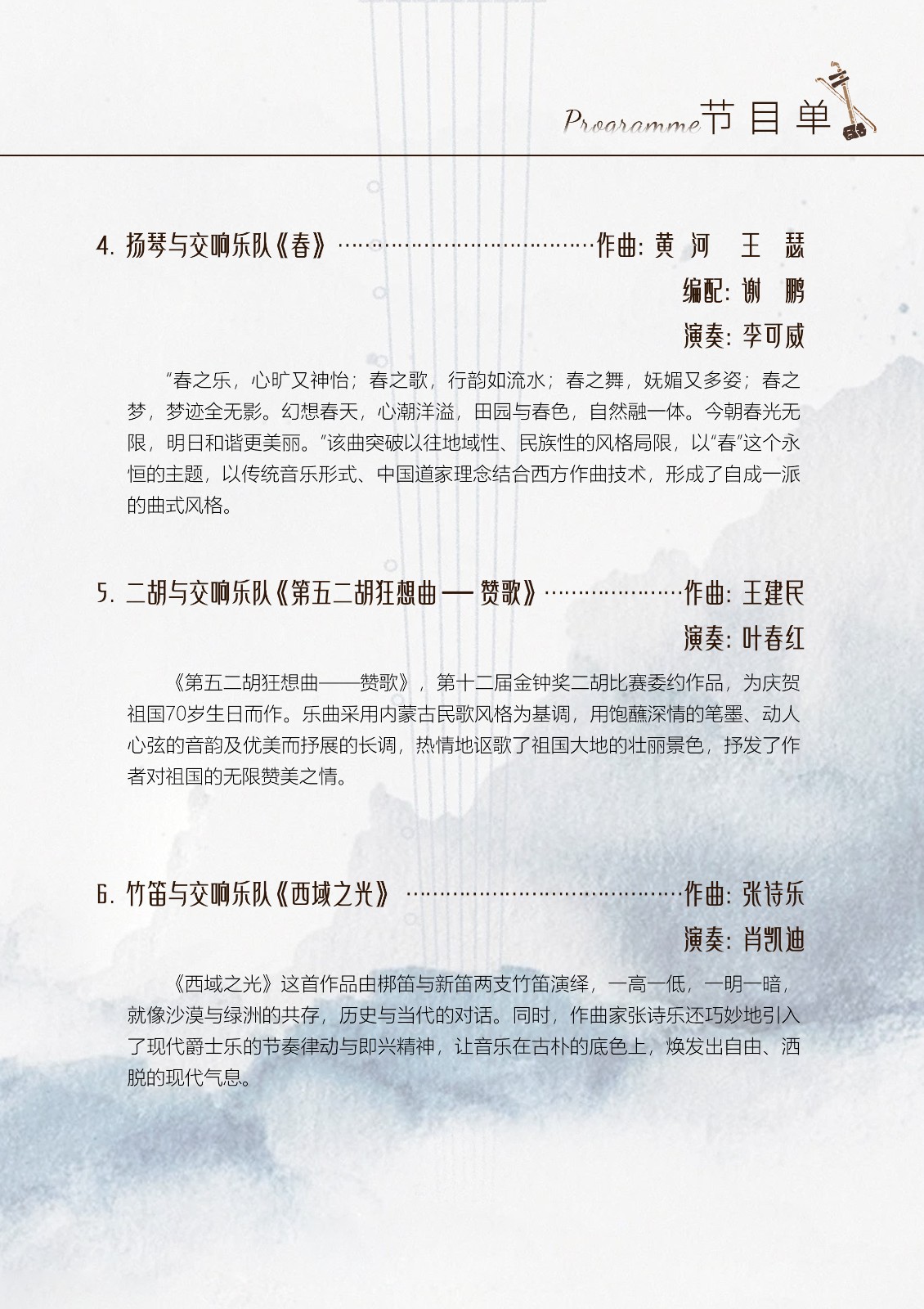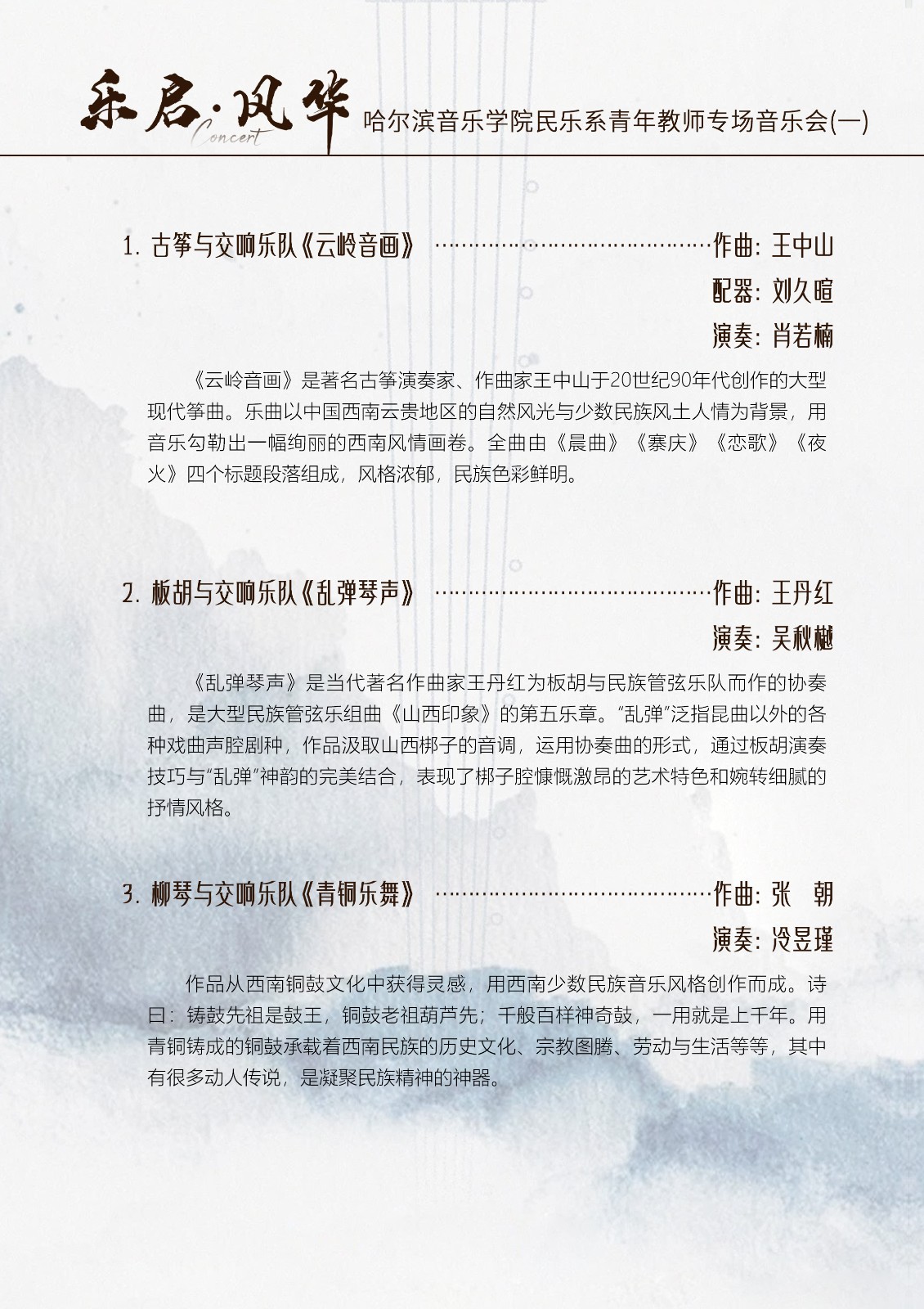 5月2日,哈尔滨音乐学院民乐系将携手学院中俄交响乐团,在哈尔滨音乐厅呈现一场高水准的青年教师专场音乐会,以乐赋能哈尔滨“五一”假日文旅。本场音乐会汇集多位曾获国家级奖项“文华奖”的民乐青年教师,演绎多部兼具艺术性、技巧性与时代气息的民乐佳作,展现传统民乐与现代交响的融合,呈现哈音民乐系的教学实力与舞台风采。