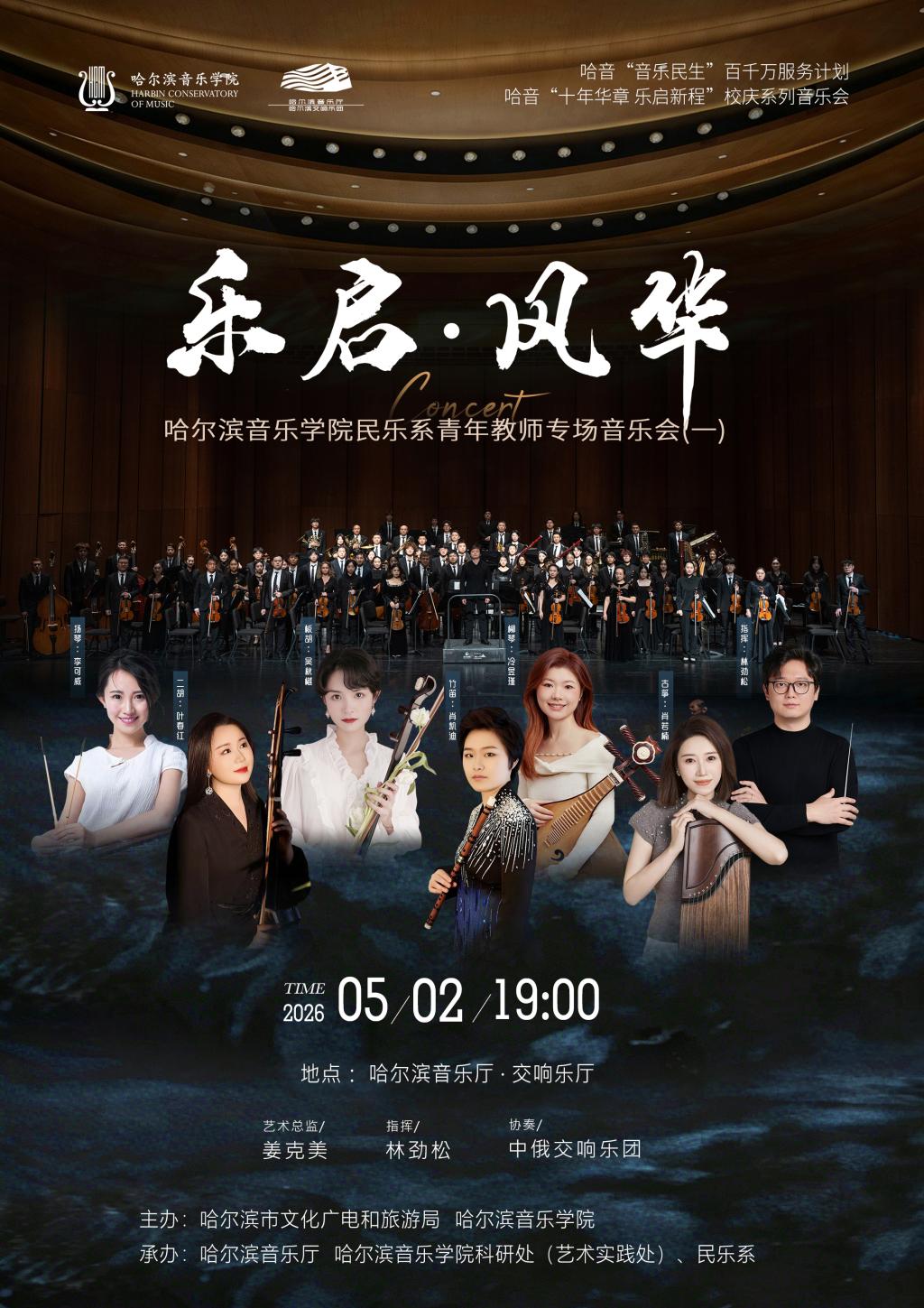 作为哈尔滨音乐学院十周年校庆系列活动的核心项目之一,本场音乐会是学院深入实施“音乐民生”千百万服务计划、以专业艺术主动服务地方文旅发展、用音乐回馈家乡的重要实践。通过精湛的演绎与深情的表达,呈现民乐与交响的融合创新,传递对黑土地的热爱与对中华文化的坚守,为“尔滨”文旅注入深厚的艺术内涵与情感温度,助力城市文化繁荣与文旅品牌提升,展现高校艺术教育的社会责任与时代担当。