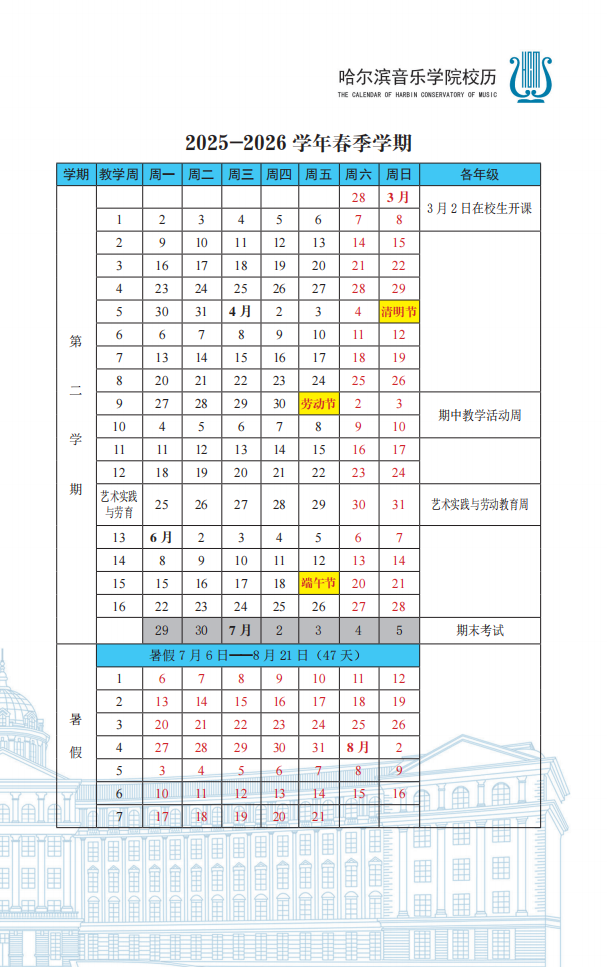 哈尔滨音乐学院2025-2026学年校历