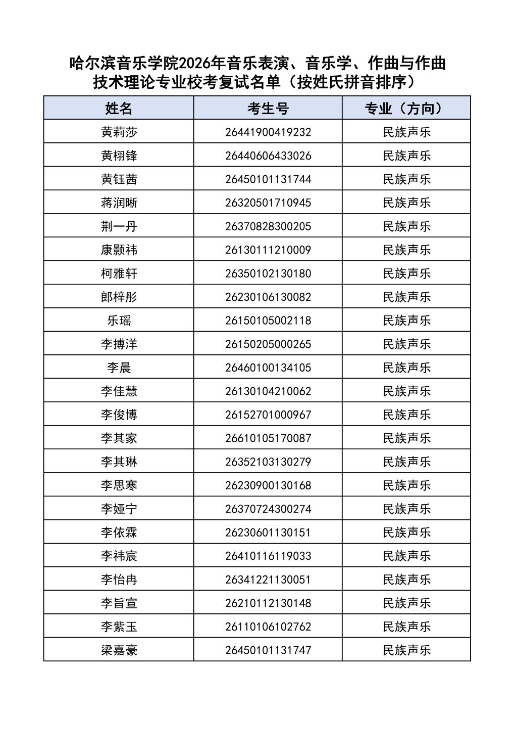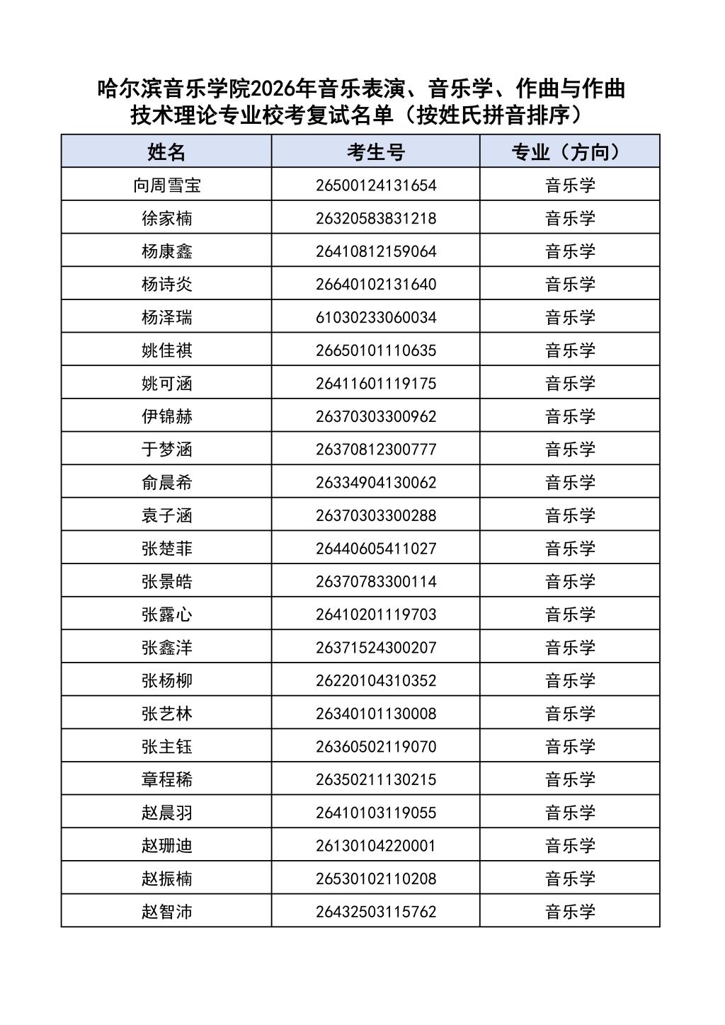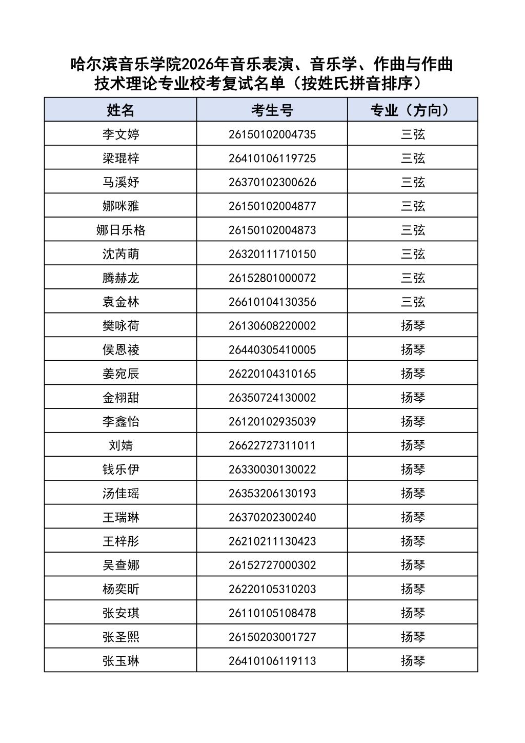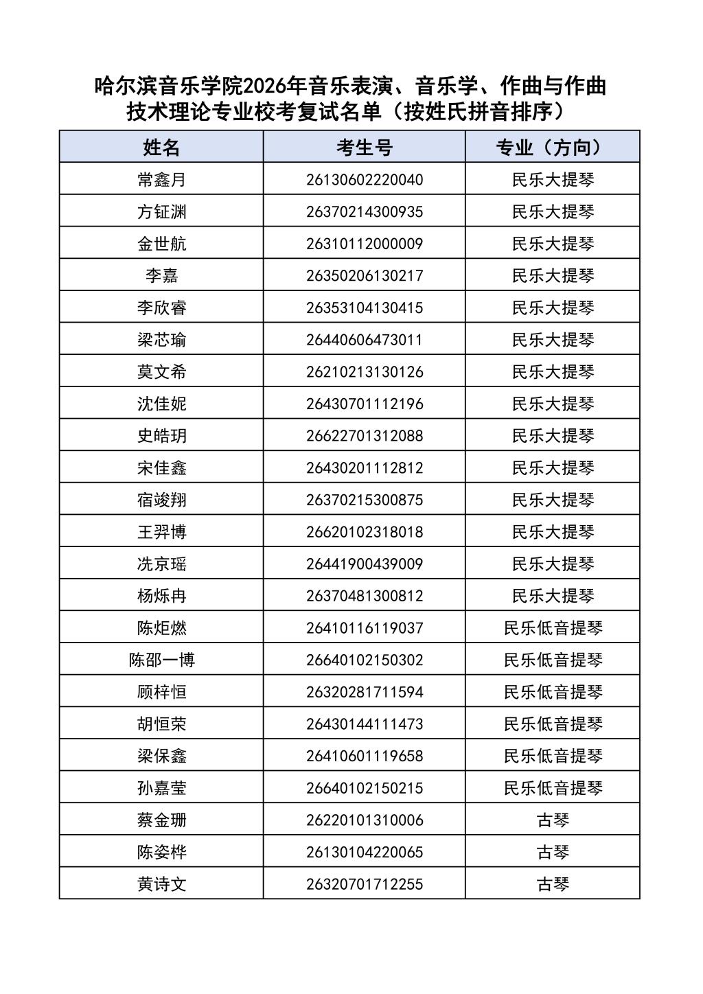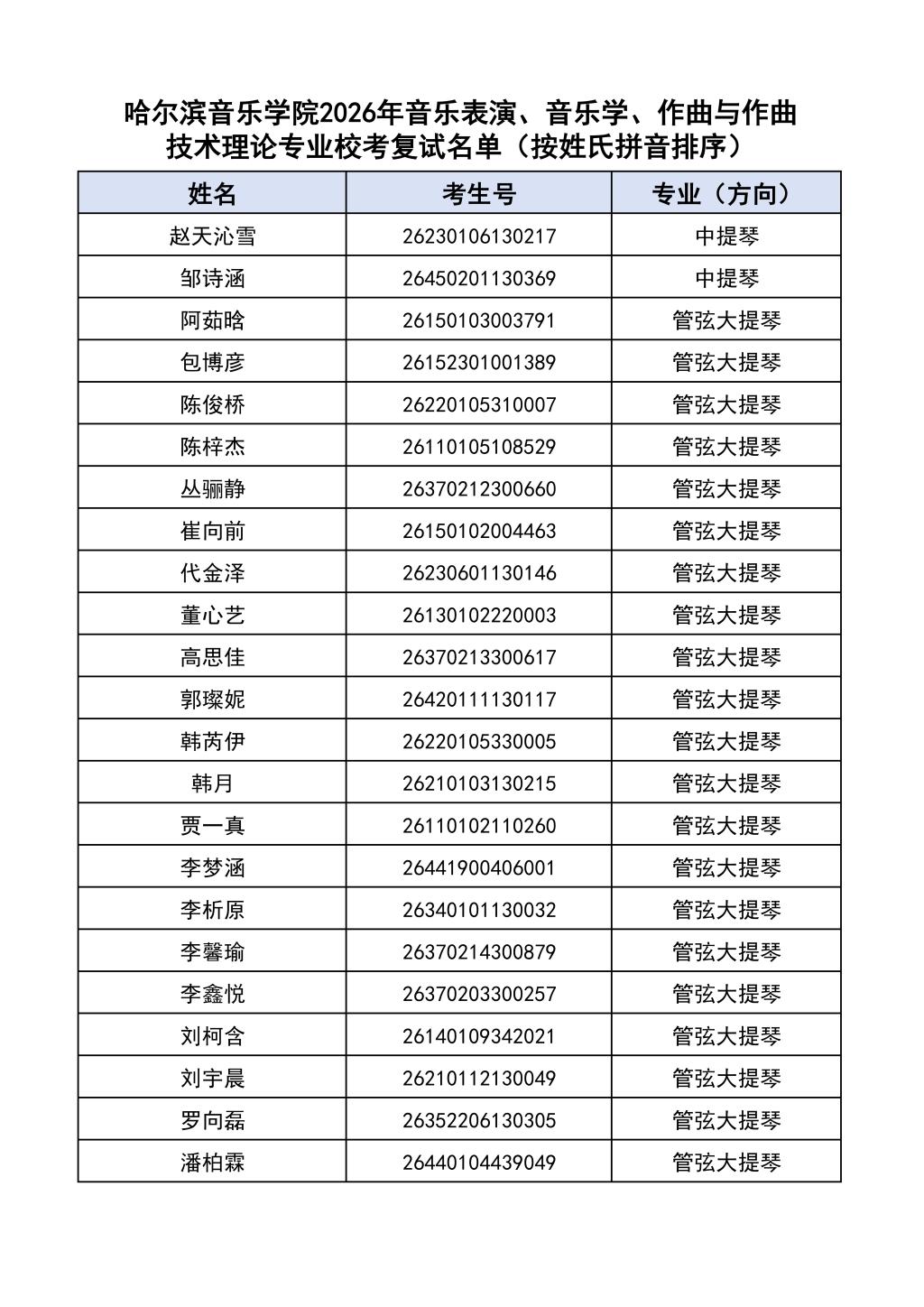 按照教育部和黑龙江省教育厅关于艺术类专业招生考试工作的相关要求,依据《哈尔滨音乐学院2026年本科招生简章》和《哈尔滨音乐学院2026年本科招生专业课考试工作方案》要求,现将学院2026年本科专业校考复试名单及复试相关工作通知如下: