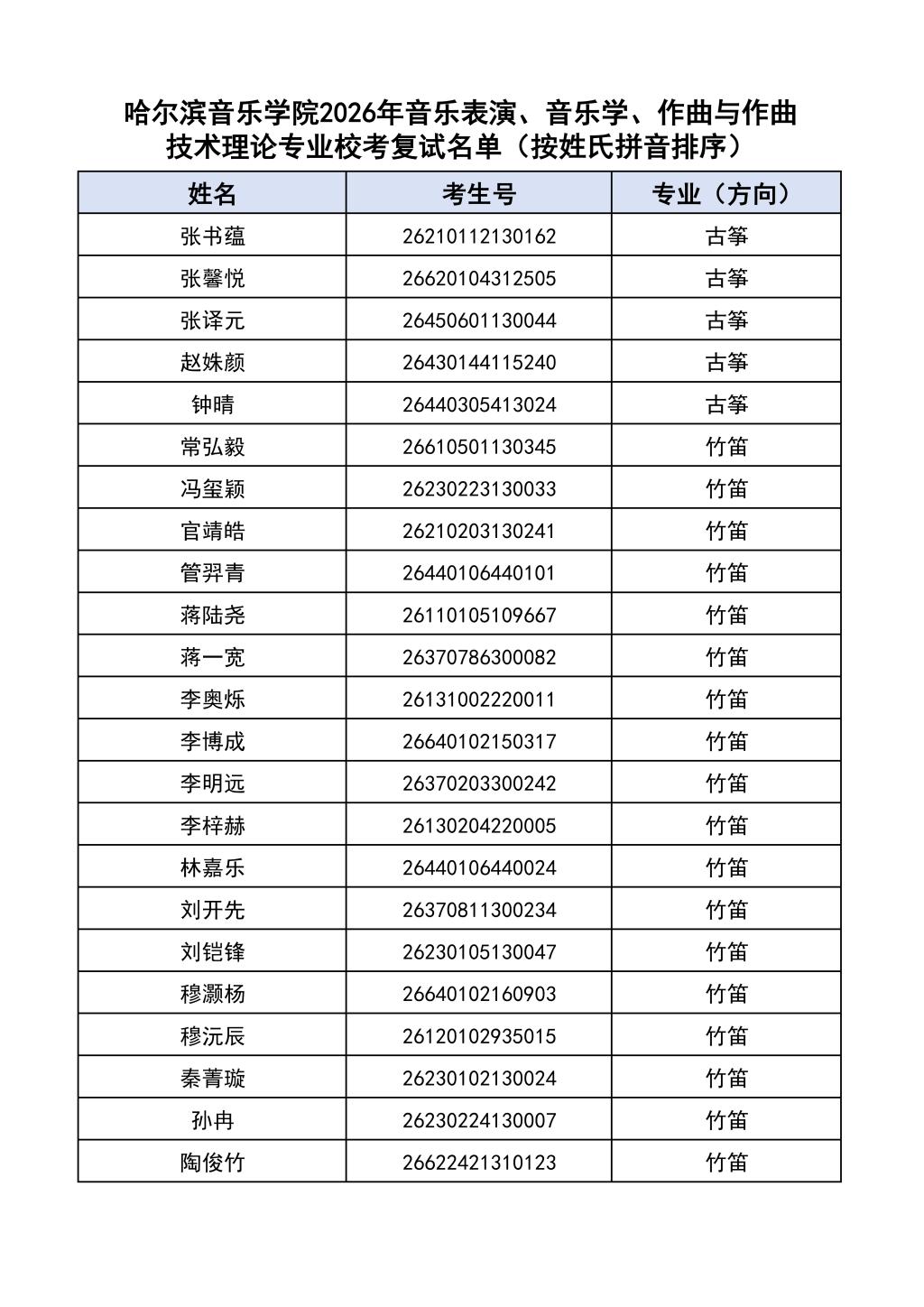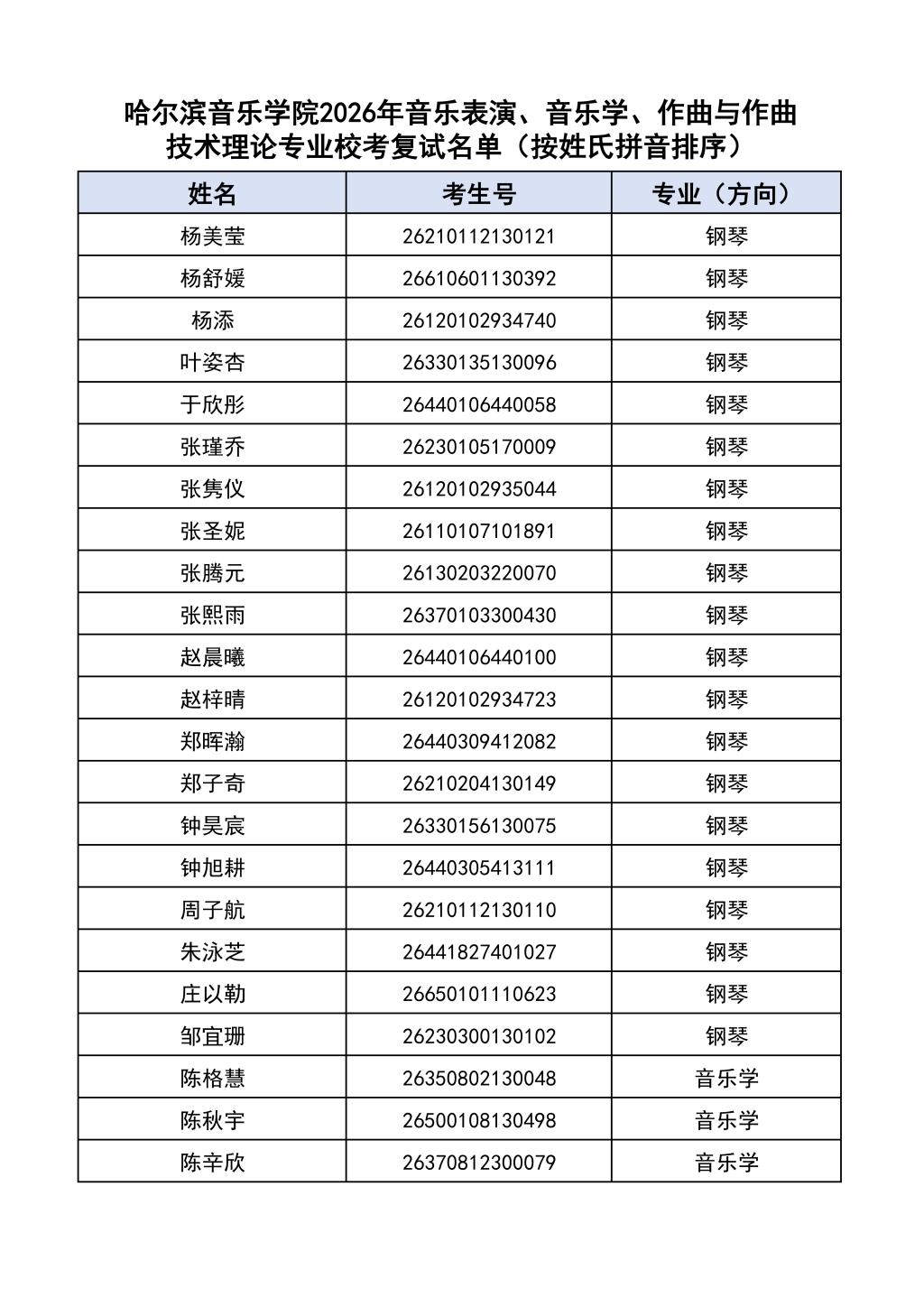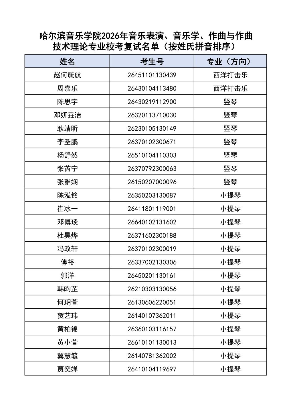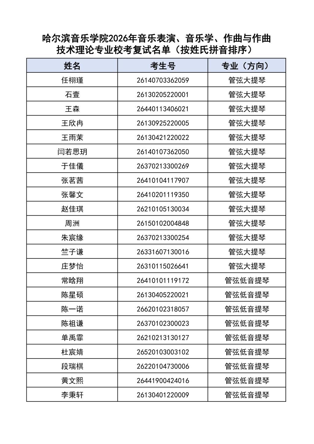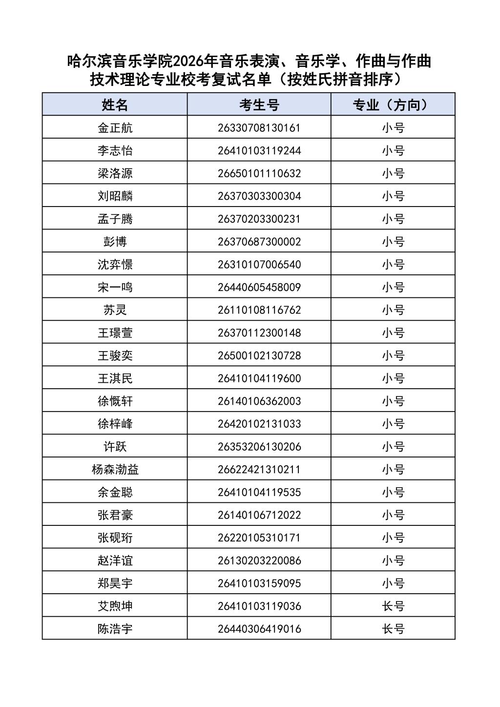 按照教育部和黑龙江省教育厅关于艺术类专业招生考试工作的相关要求,依据《哈尔滨音乐学院2026年本科招生简章》和《哈尔滨音乐学院2026年本科招生专业课考试工作方案》要求,现将学院2026年本科专业校考复试名单及复试相关工作通知如下: