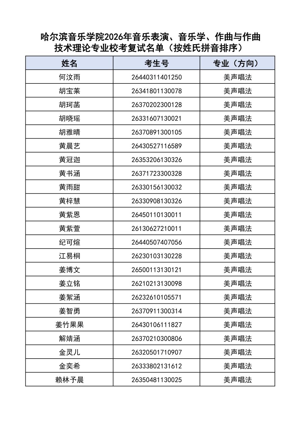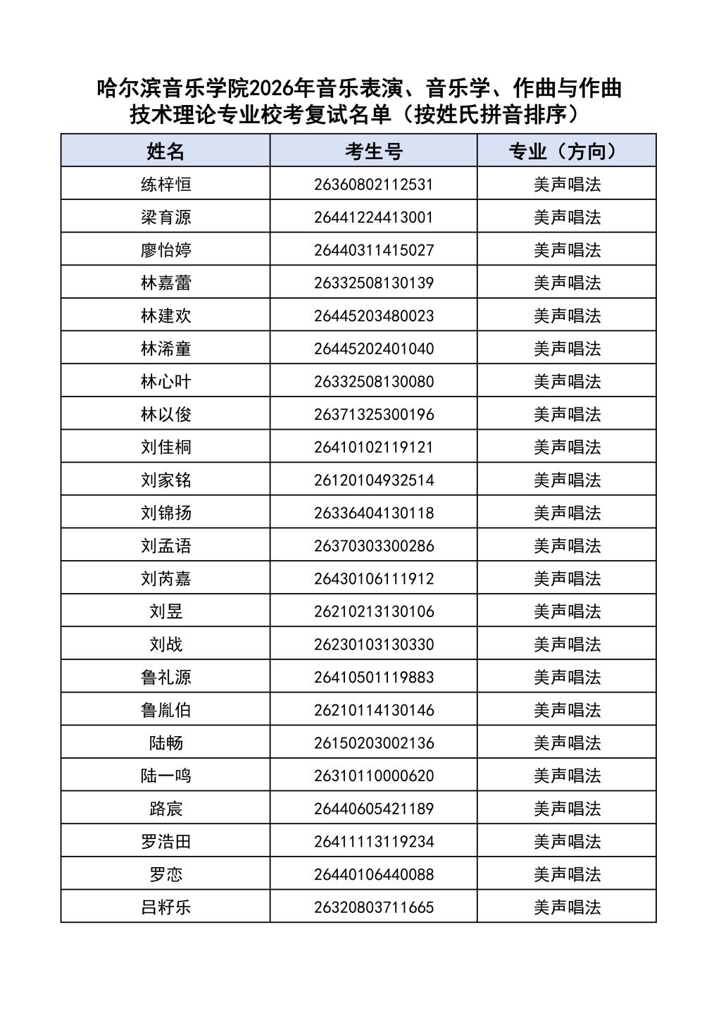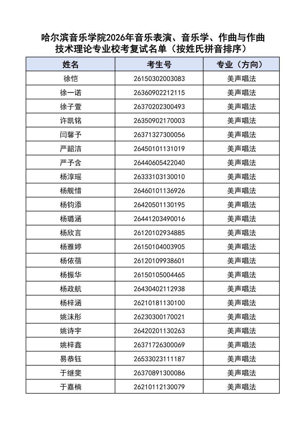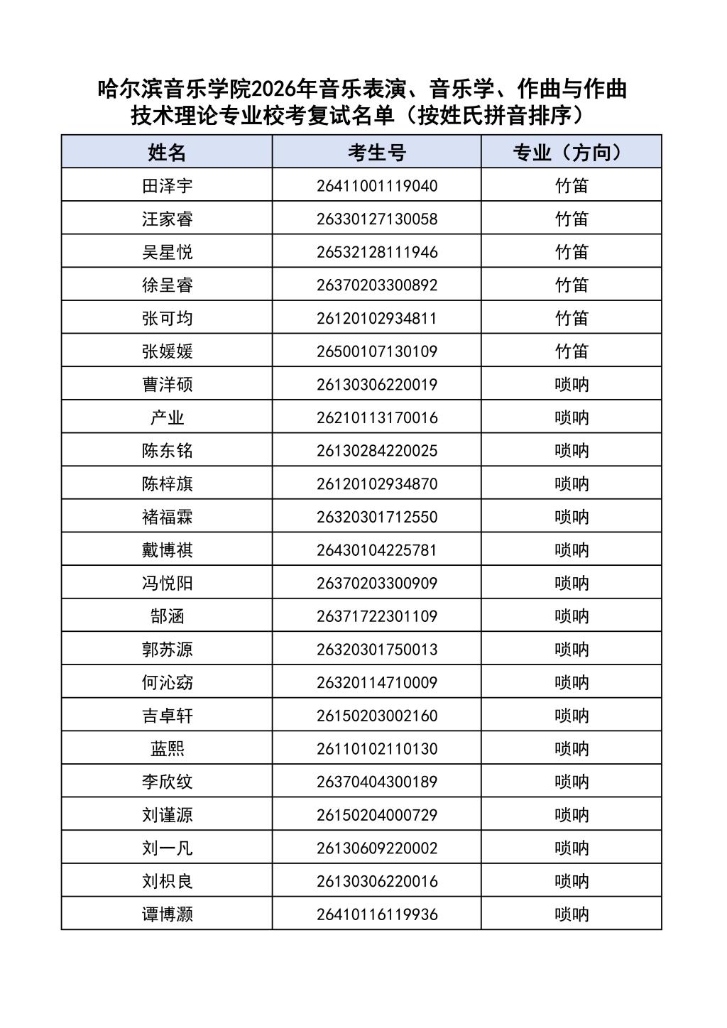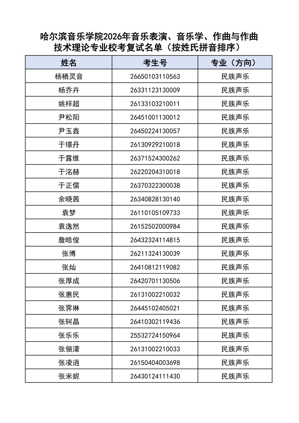 按照教育部和黑龙江省教育厅关于艺术类专业招生考试工作的相关要求,依据《哈尔滨音乐学院2026年本科招生简章》和《哈尔滨音乐学院2026年本科招生专业课考试工作方案》要求,现将学院2026年本科专业校考复试名单及复试相关工作通知如下: