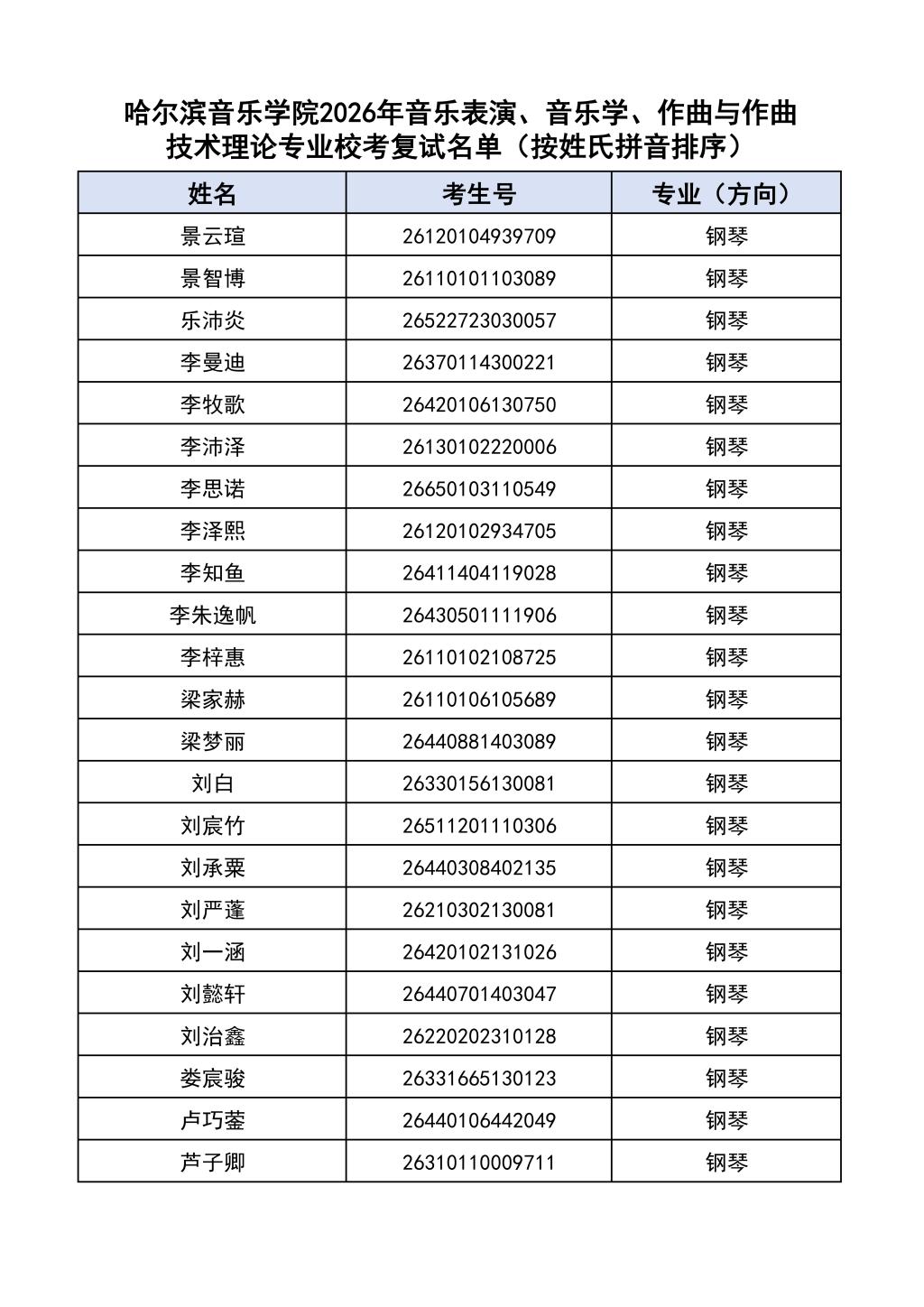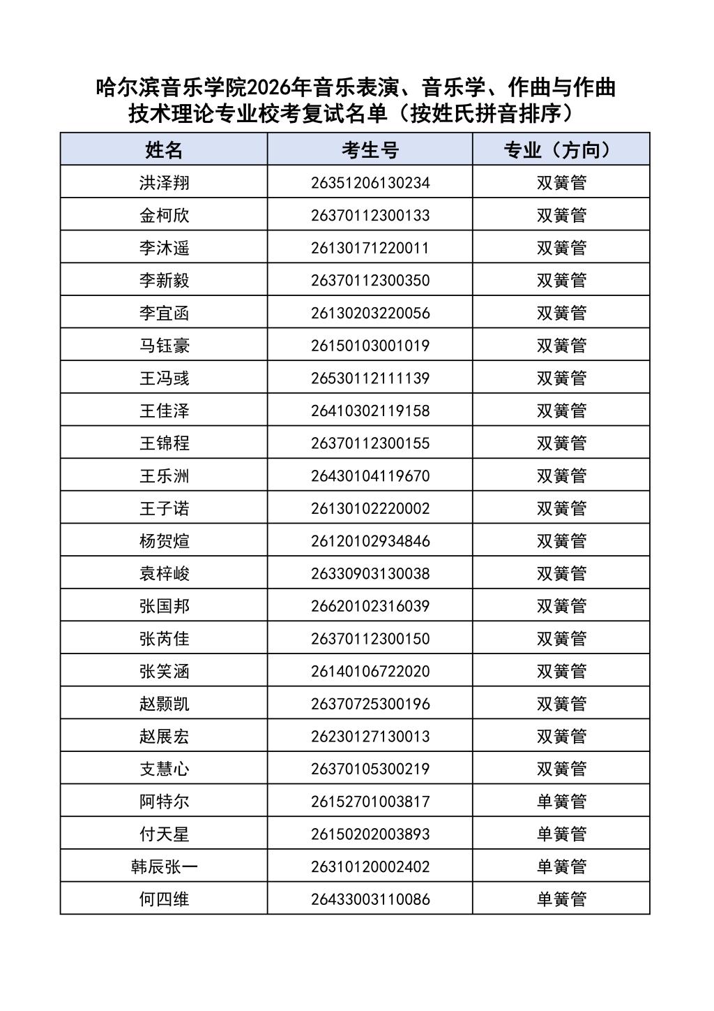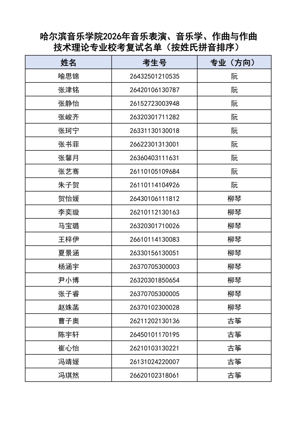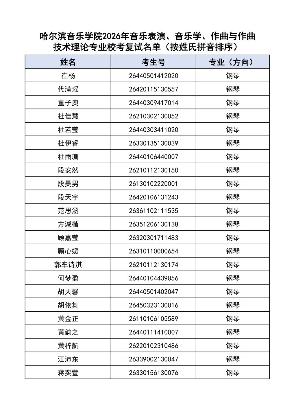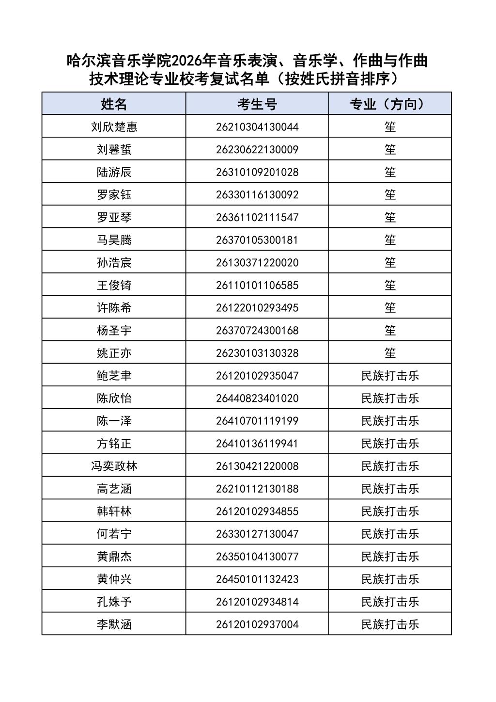 按照教育部和黑龙江省教育厅关于艺术类专业招生考试工作的相关要求,依据《哈尔滨音乐学院2026年本科招生简章》和《哈尔滨音乐学院2026年本科招生专业课考试工作方案》要求,现将学院2026年本科专业校考复试名单及复试相关工作通知如下: