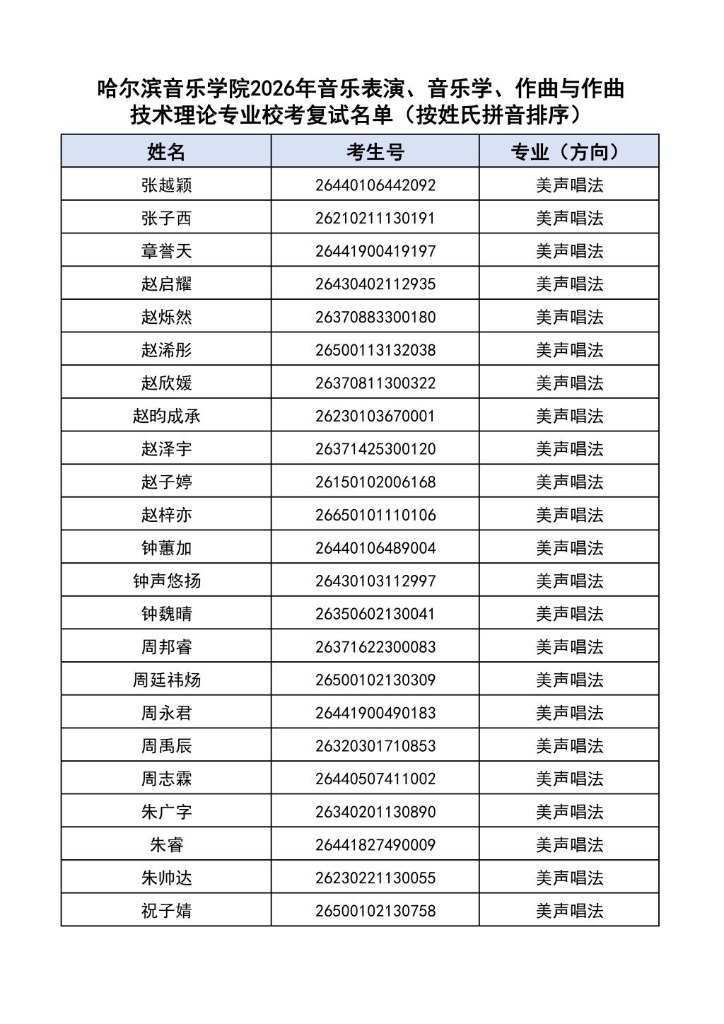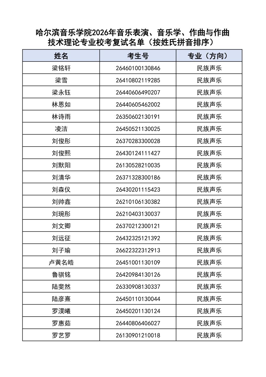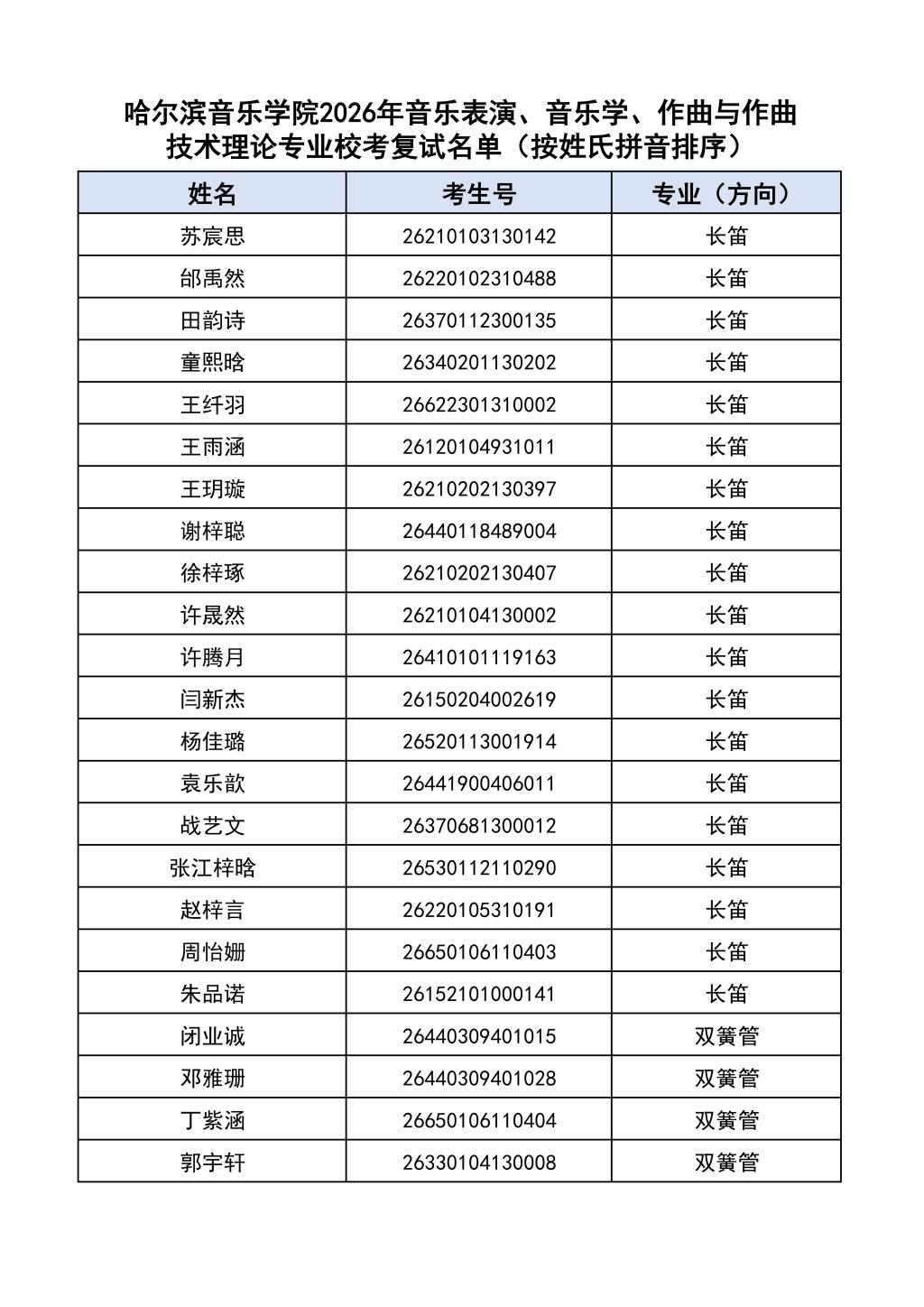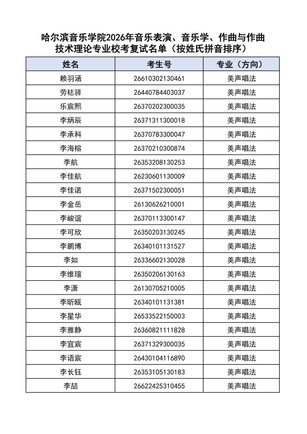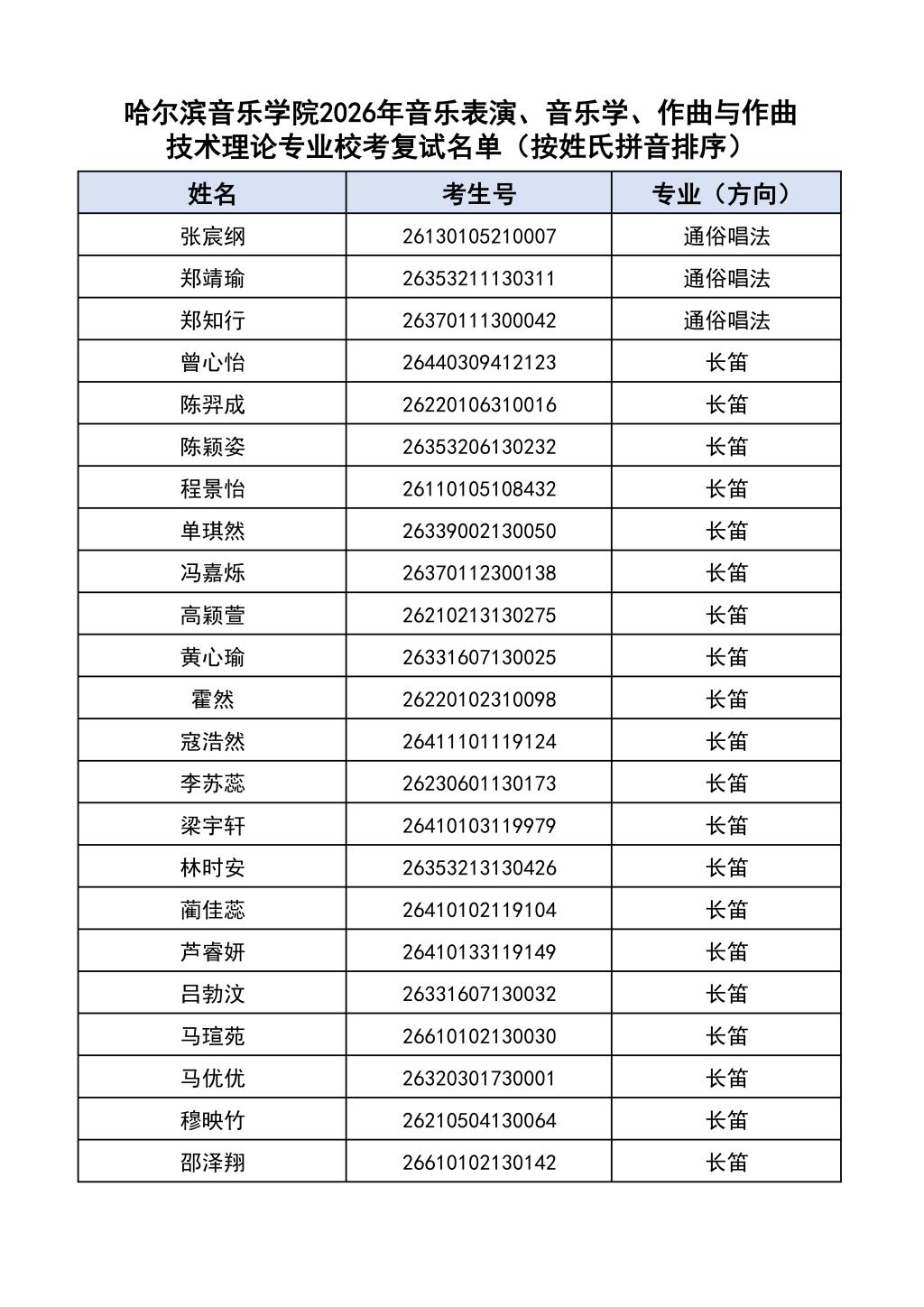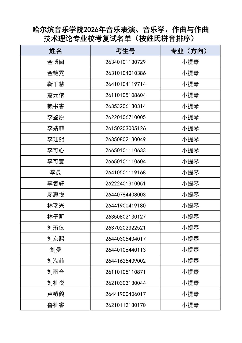 按照教育部和黑龙江省教育厅关于艺术类专业招生考试工作的相关要求,依据《哈尔滨音乐学院2026年本科招生简章》和《哈尔滨音乐学院2026年本科招生专业课考试工作方案》要求,现将学院2026年本科专业校考复试名单及复试相关工作通知如下: