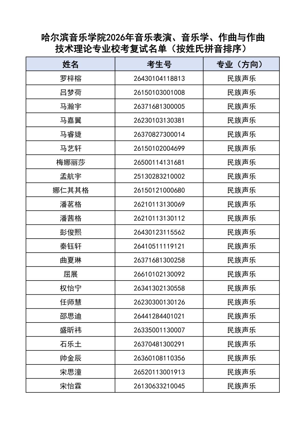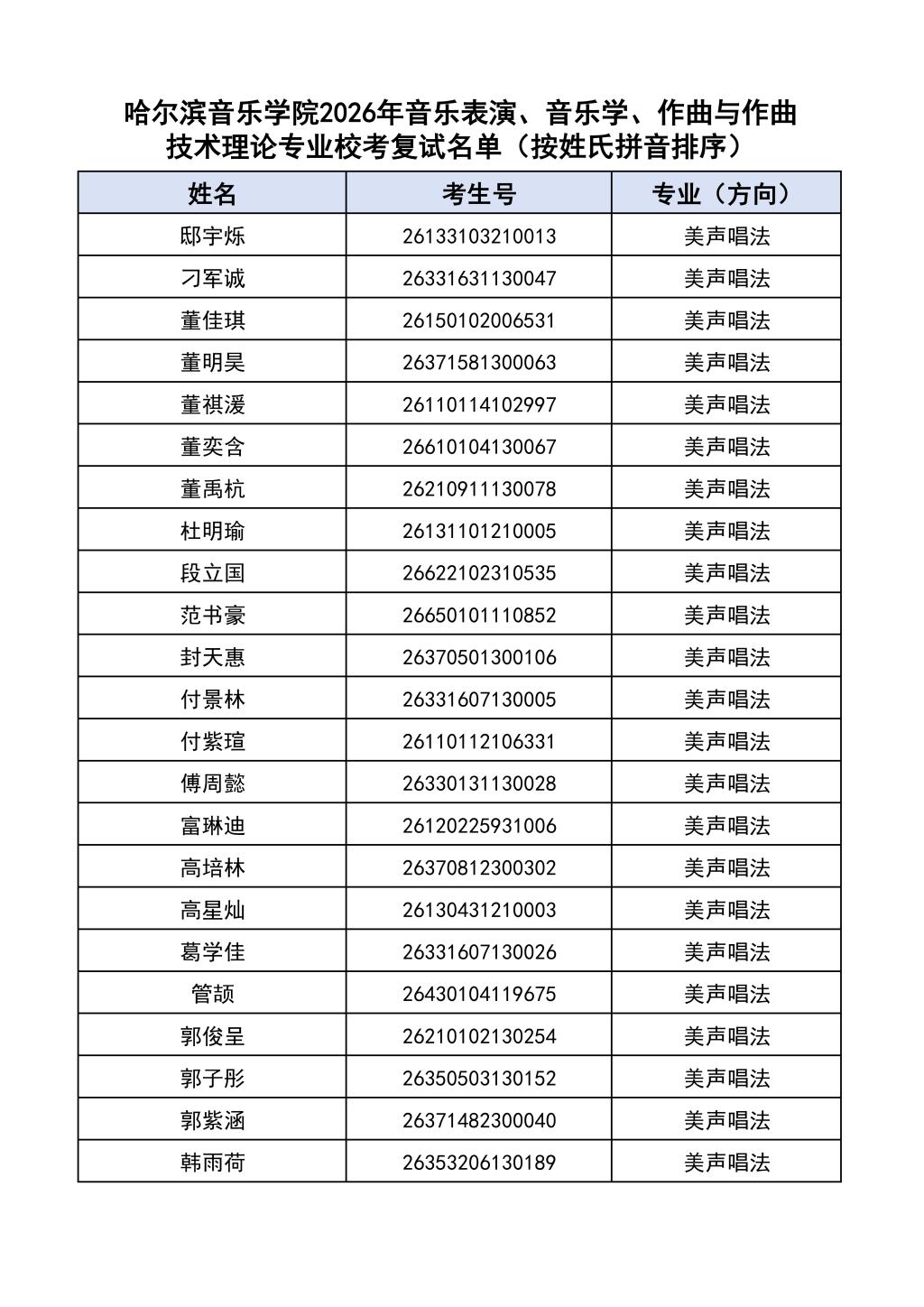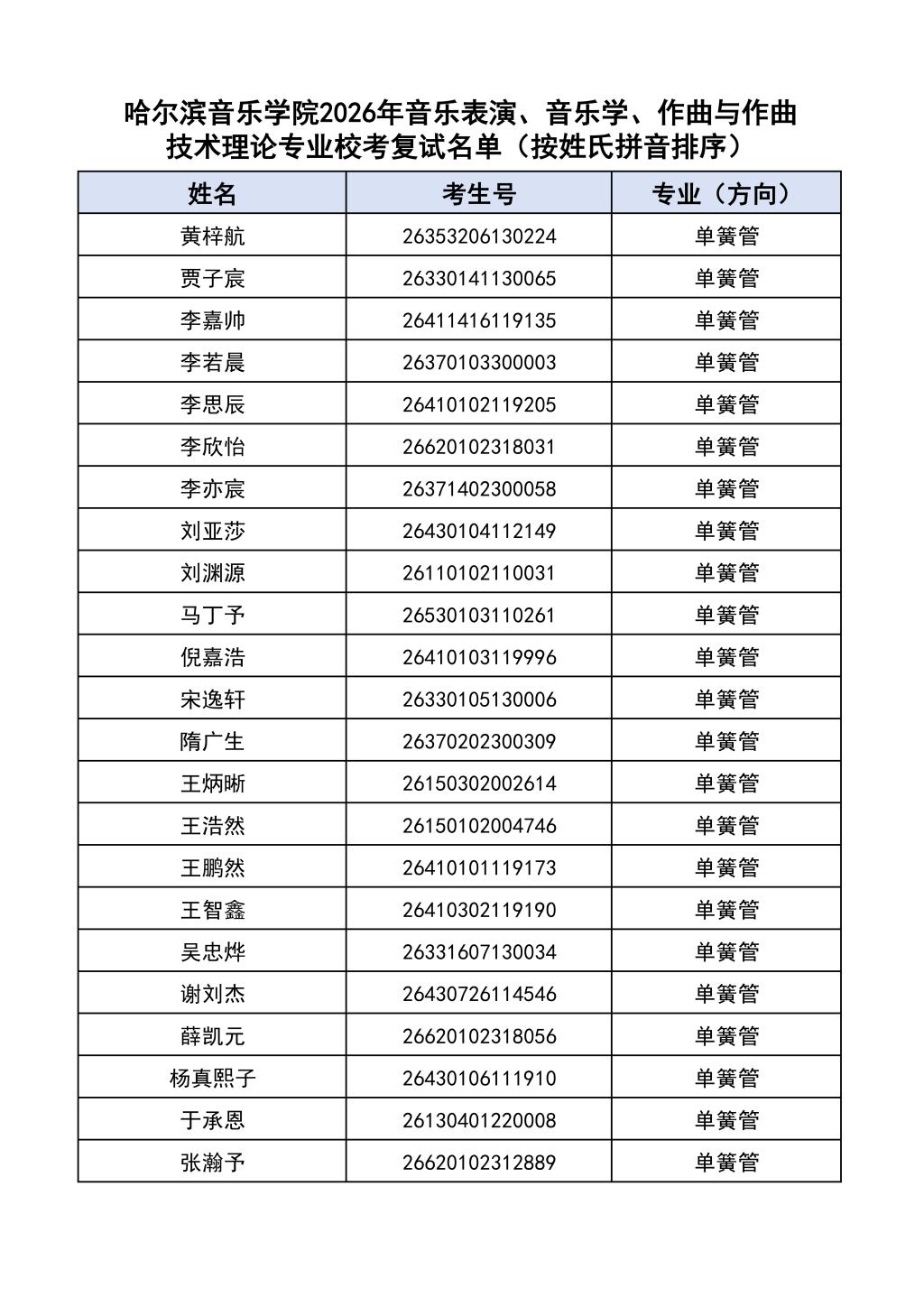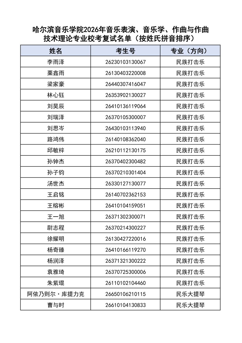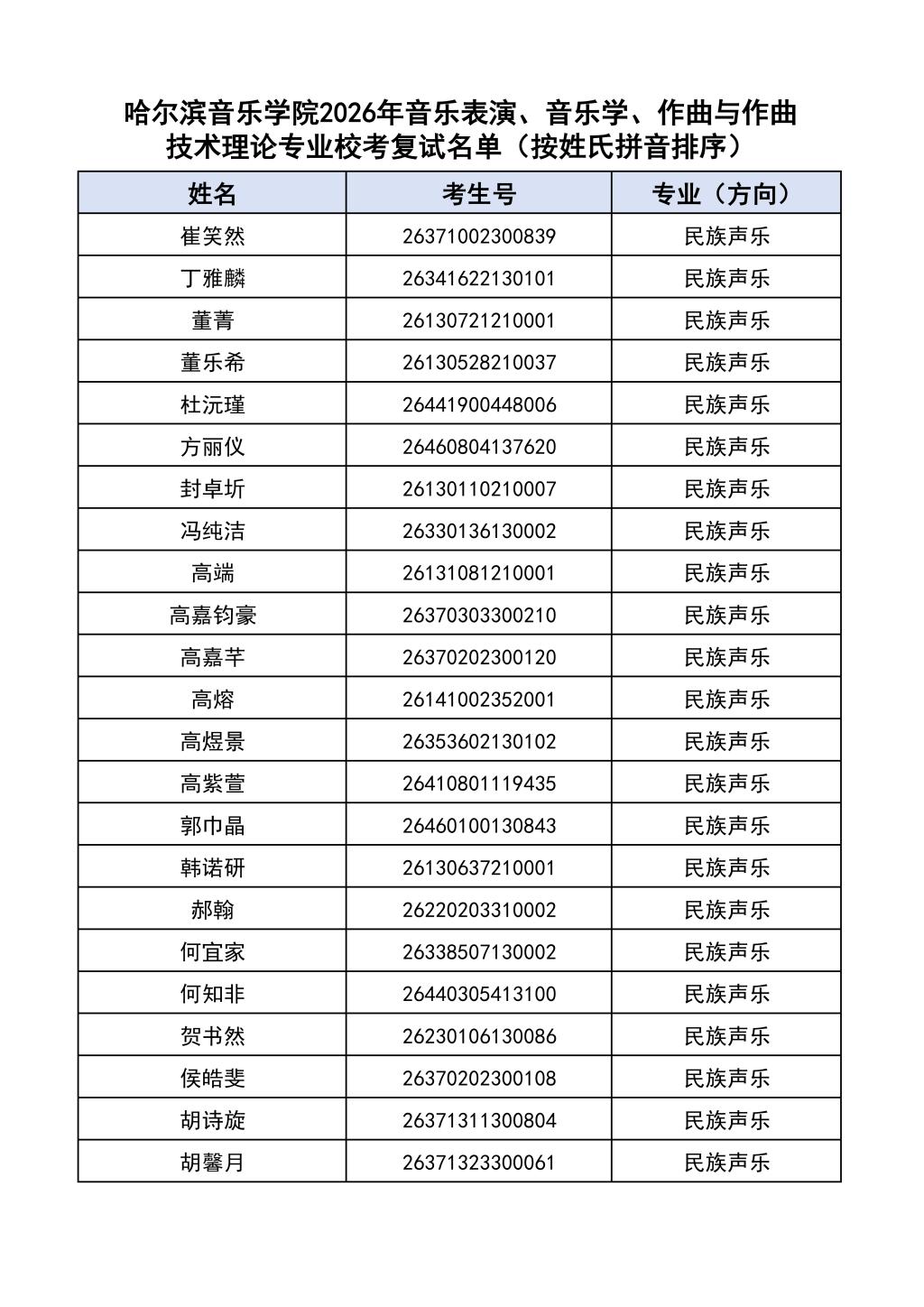 按照教育部和黑龙江省教育厅关于艺术类专业招生考试工作的相关要求,依据《哈尔滨音乐学院2026年本科招生简章》和《哈尔滨音乐学院2026年本科招生专业课考试工作方案》要求,现将学院2026年本科专业校考复试名单及复试相关工作通知如下: