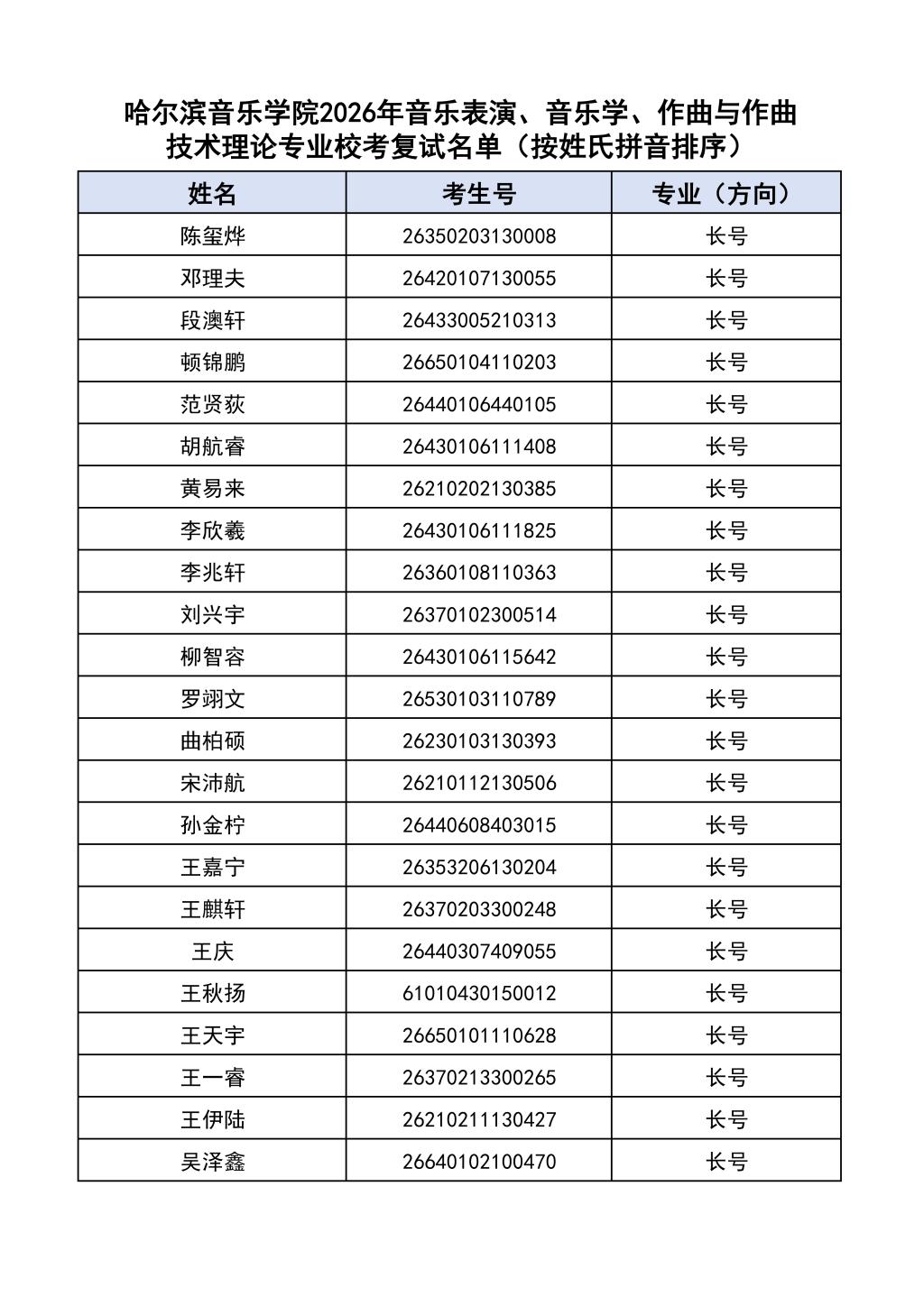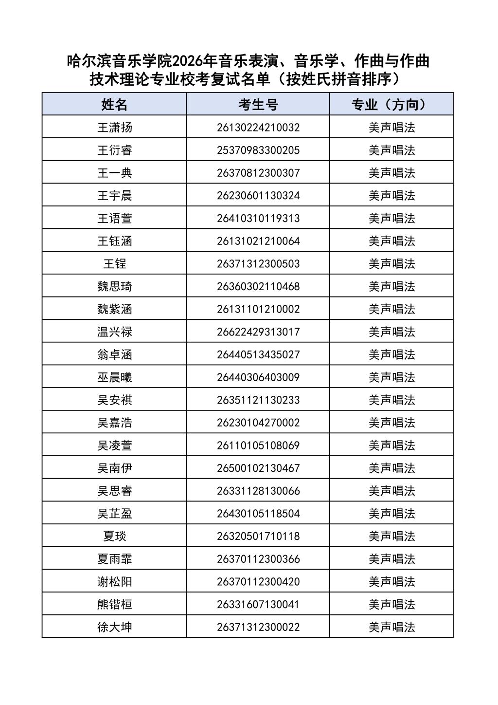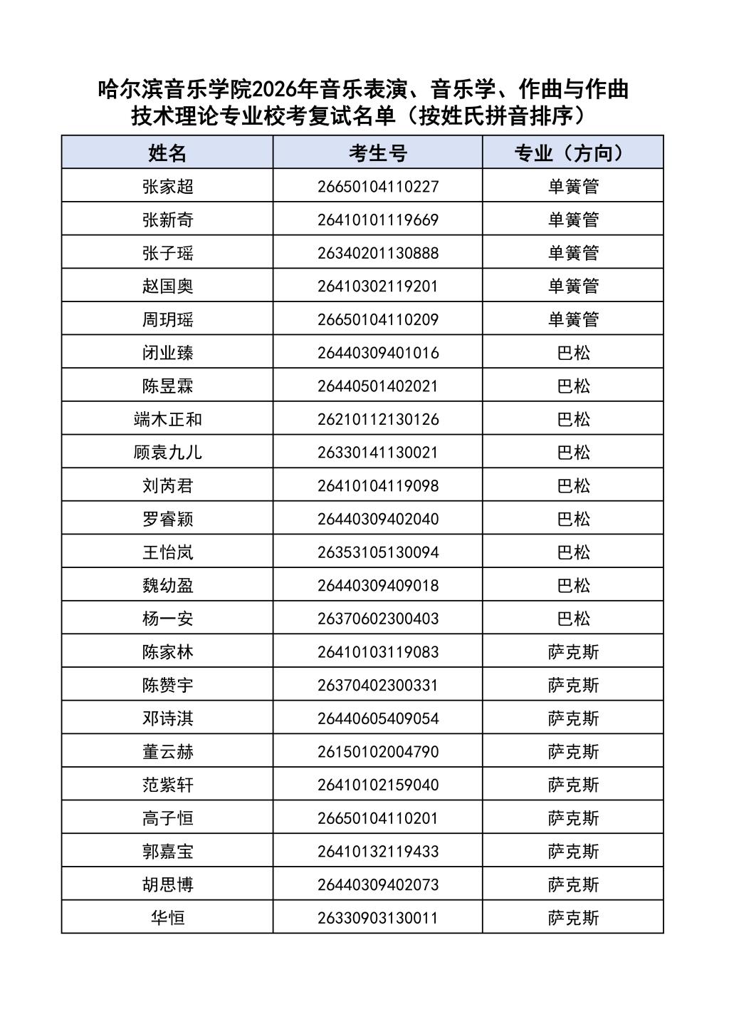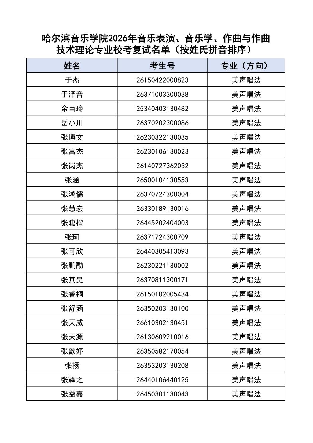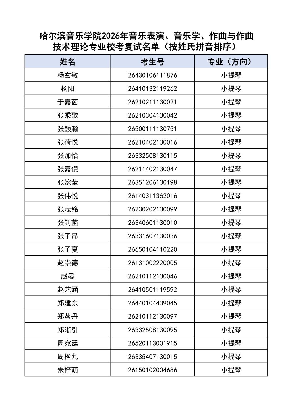 按照教育部和黑龙江省教育厅关于艺术类专业招生考试工作的相关要求,依据《哈尔滨音乐学院2026年本科招生简章》和《哈尔滨音乐学院2026年本科招生专业课考试工作方案》要求,现将学院2026年本科专业校考复试名单及复试相关工作通知如下: