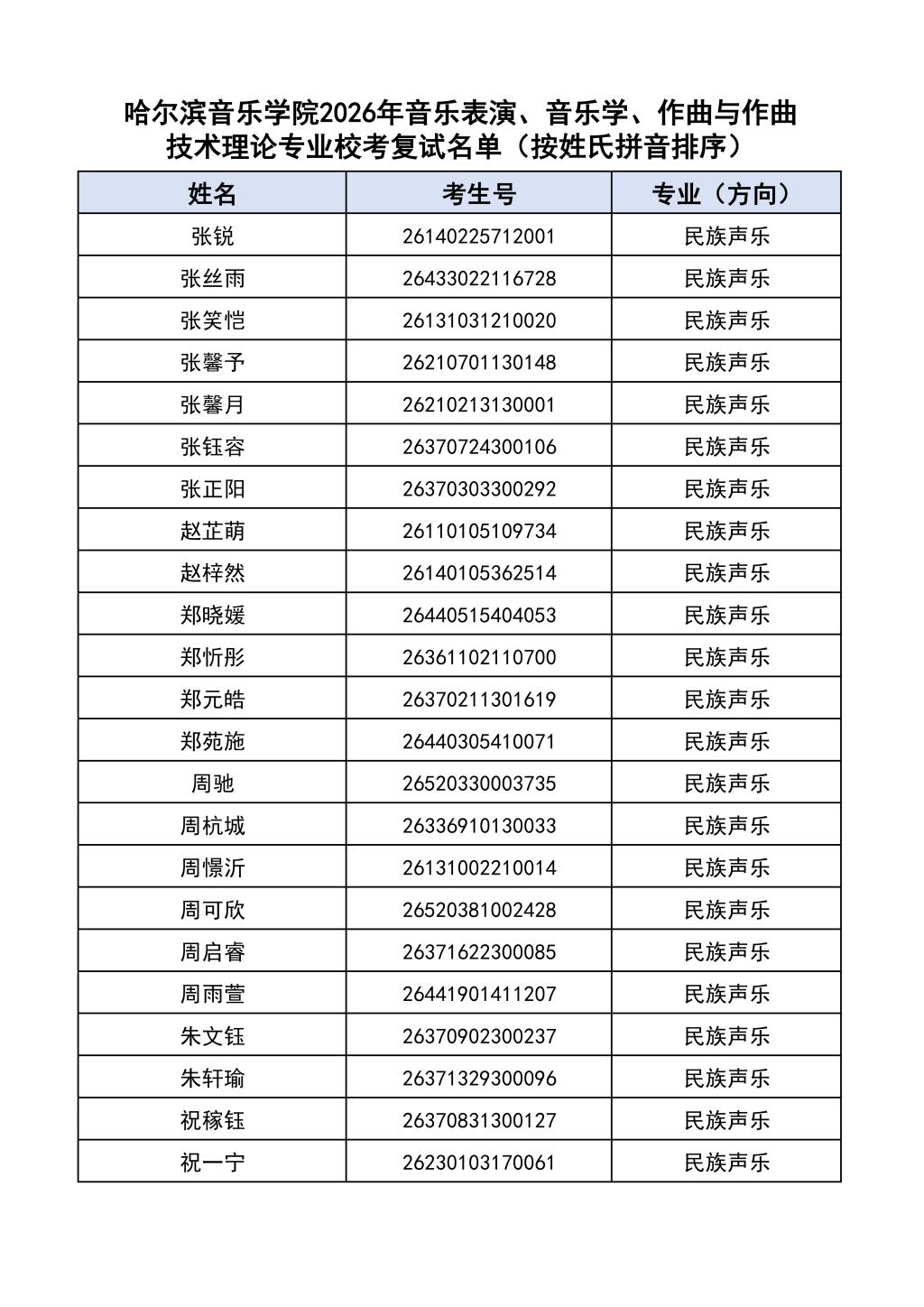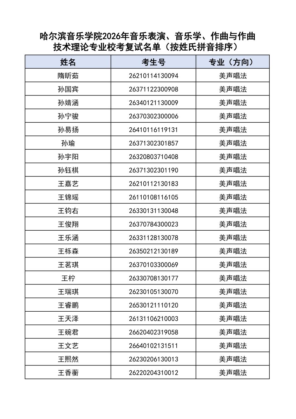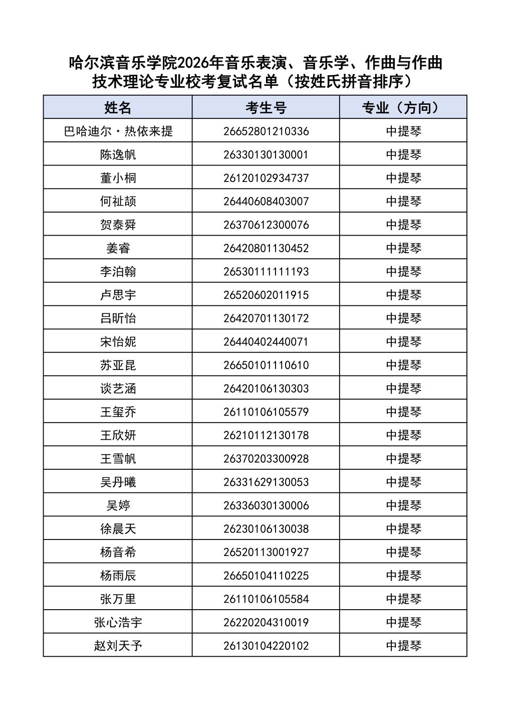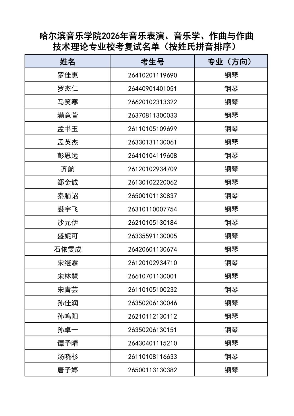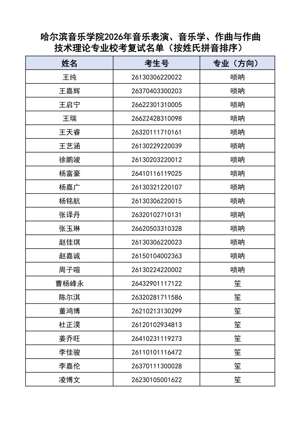 按照教育部和黑龙江省教育厅关于艺术类专业招生考试工作的相关要求,依据《哈尔滨音乐学院2026年本科招生简章》和《哈尔滨音乐学院2026年本科招生专业课考试工作方案》要求,现将学院2026年本科专业校考复试名单及复试相关工作通知如下: