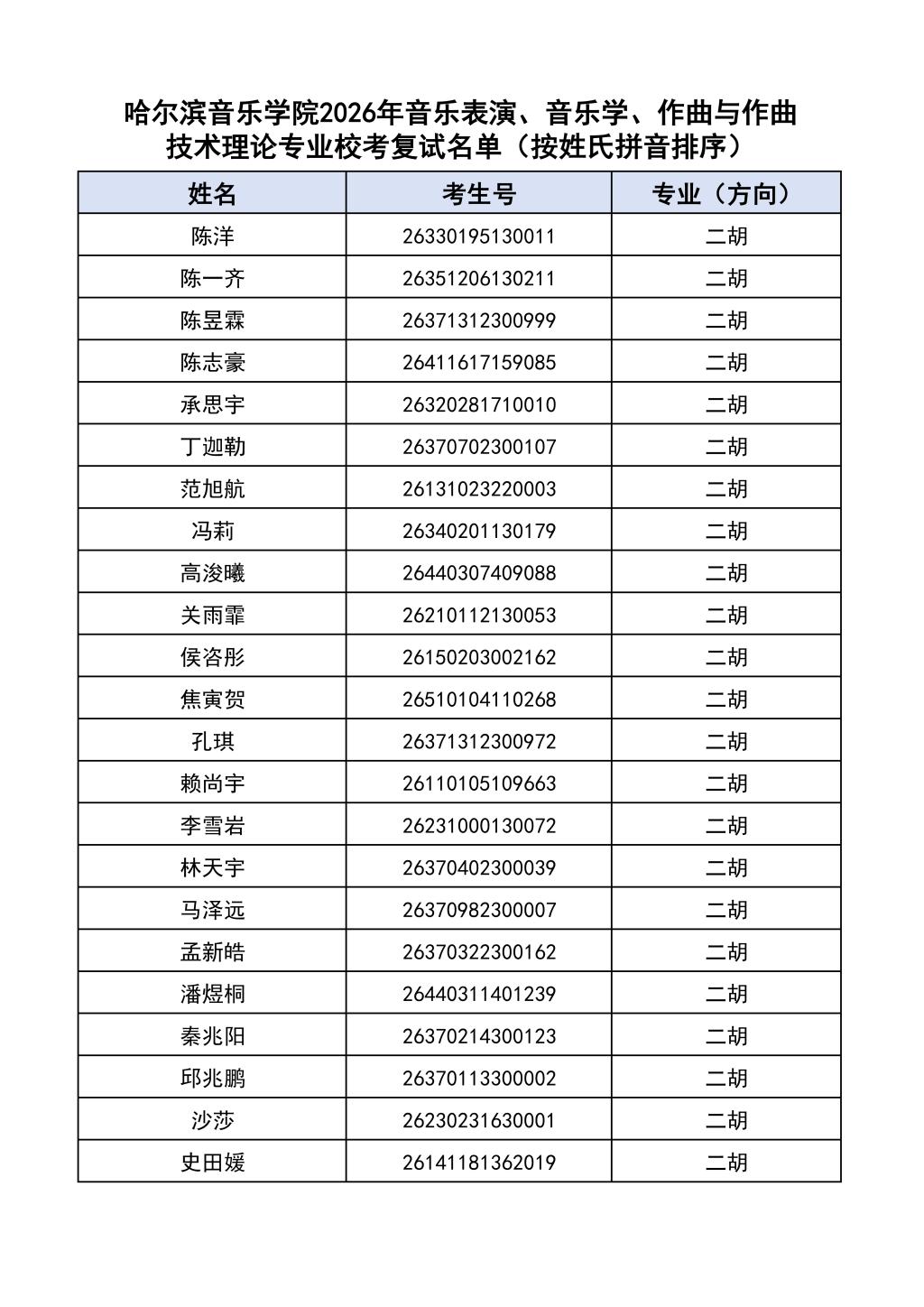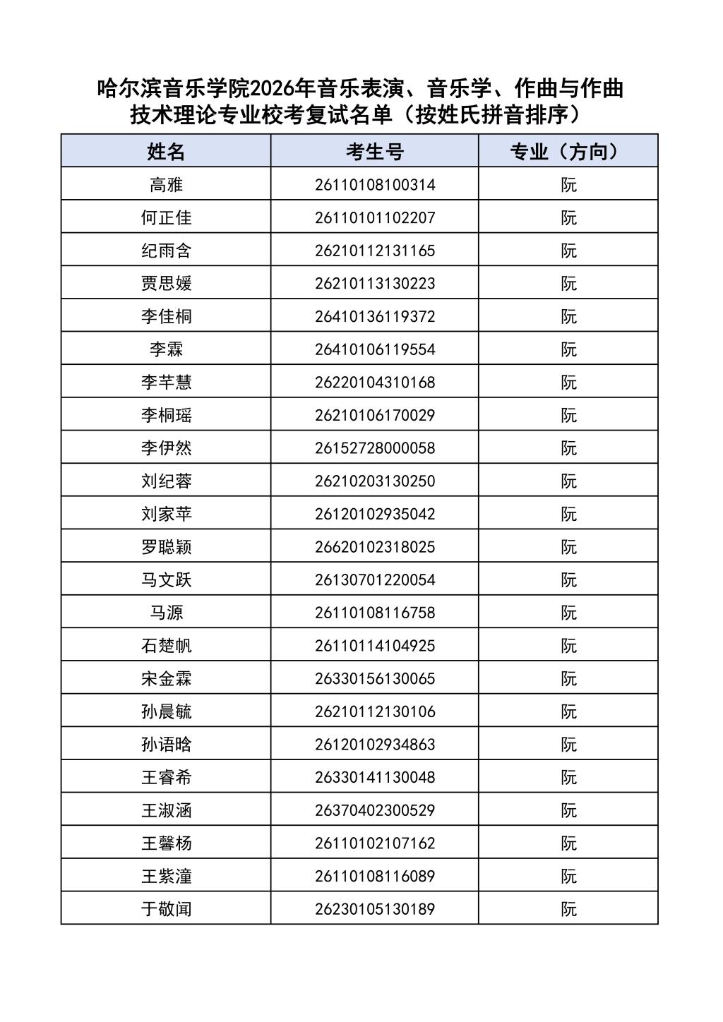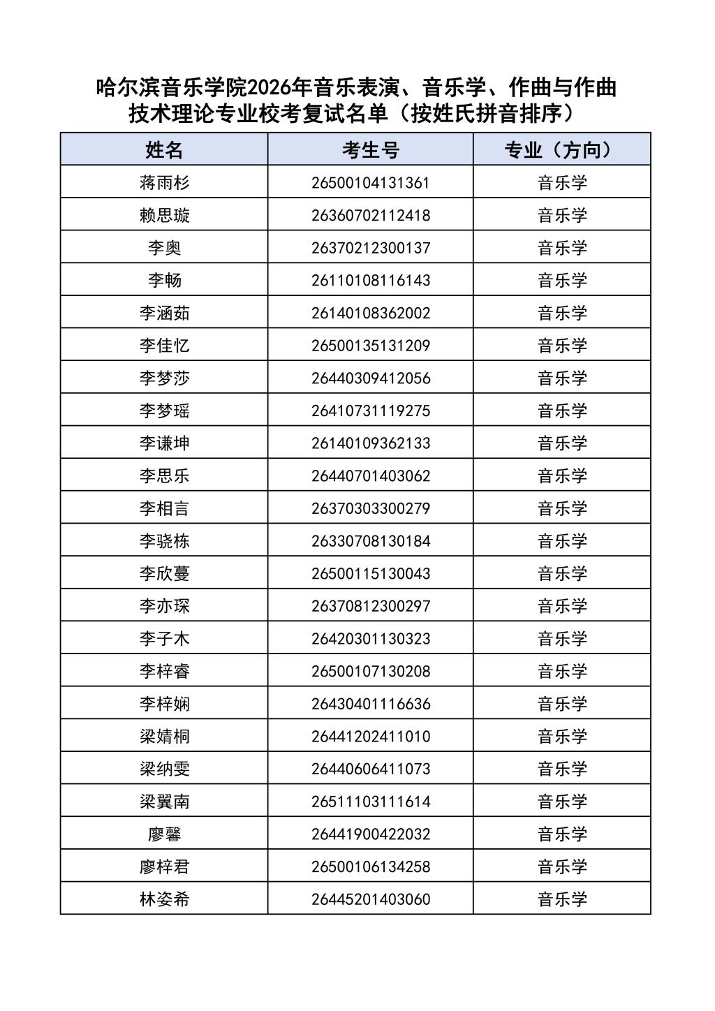 学院2026年音乐表演、音乐学、作曲与作曲技术理论本科专业校考复试名单见附件。