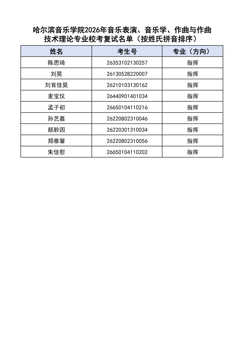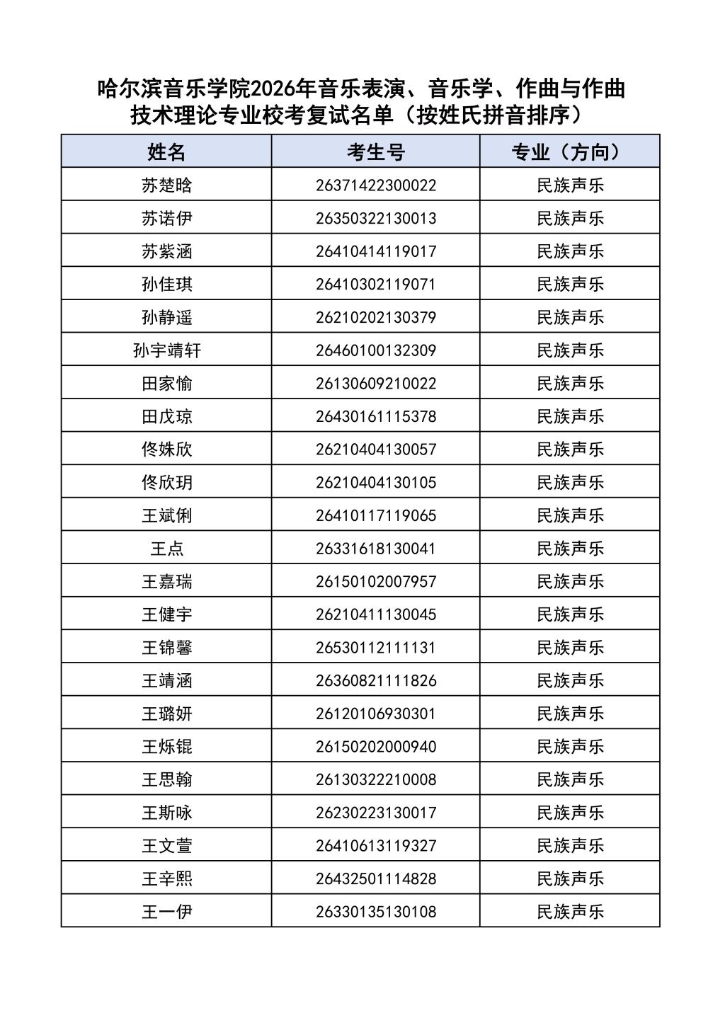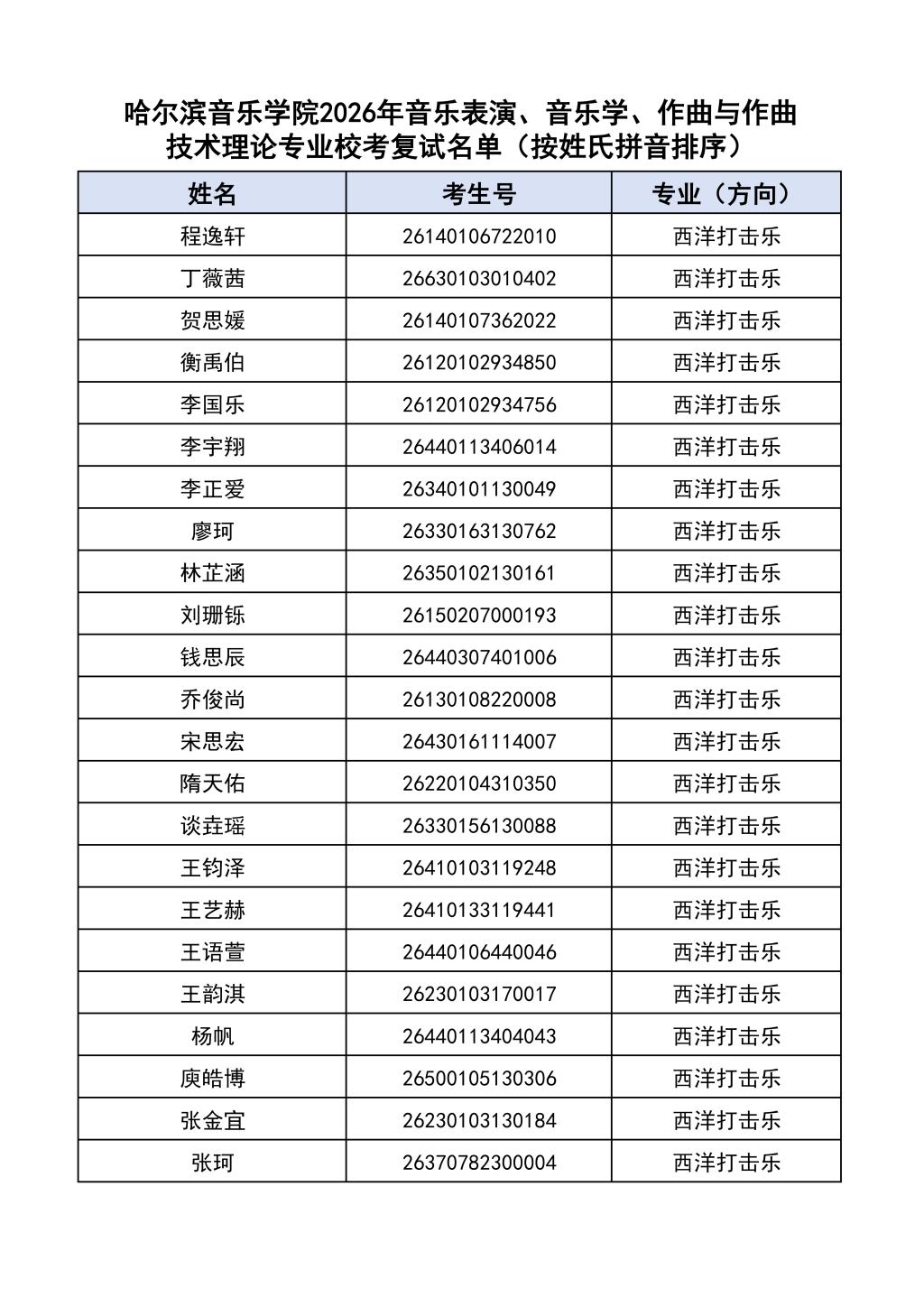 学院2026年音乐表演、音乐学、作曲与作曲技术理论本科专业校考复试名单见附件。