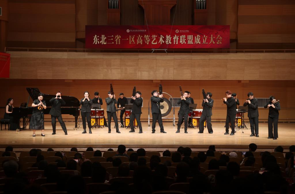 成立大会后举行的音乐舞蹈专场音乐会上,由学院创作并演出的吹打乐《天地人和》作为开场节目,以磅礴气势展现民族音乐魅力与师生专业水准。民族声乐系教师曹爽与学生崔玉林参与全体高校代表共同合唱《哦,我的大东北》,表达对东北地区的深厚情感。作曲系辅导员夏雨欣与兄弟院校教师共同主持本场音乐会。整场演出主题鲜明、形式多样,集中展示了东北地区艺术教育成果,彰显三省一区携手共进、共谱文化新篇的合作精神。