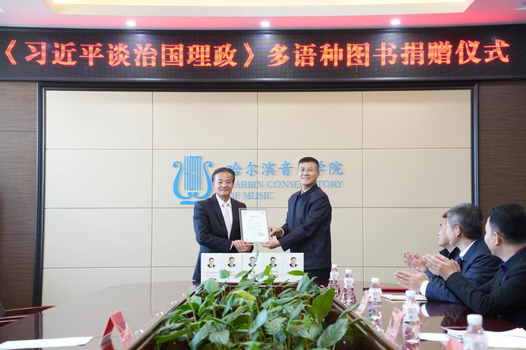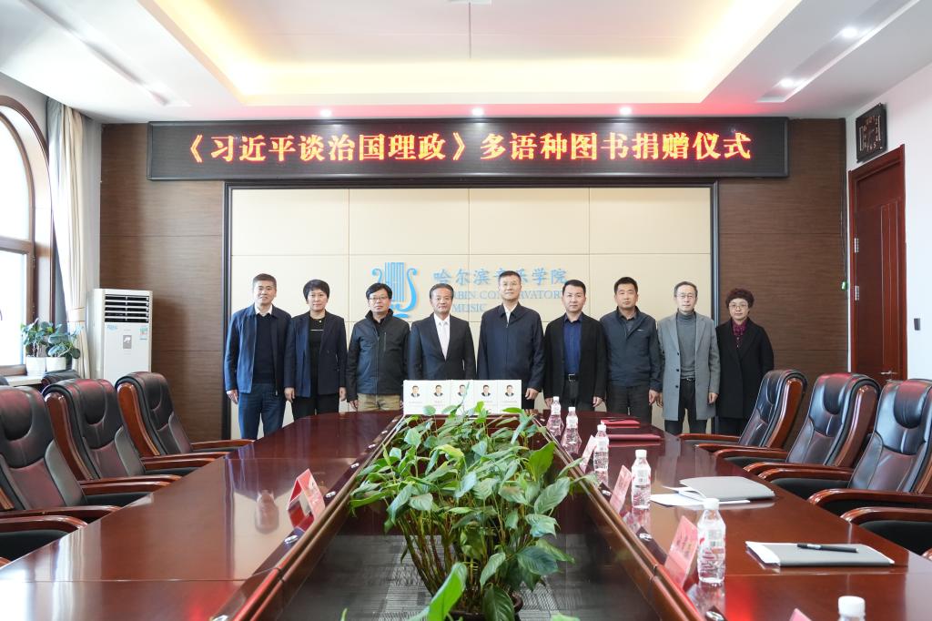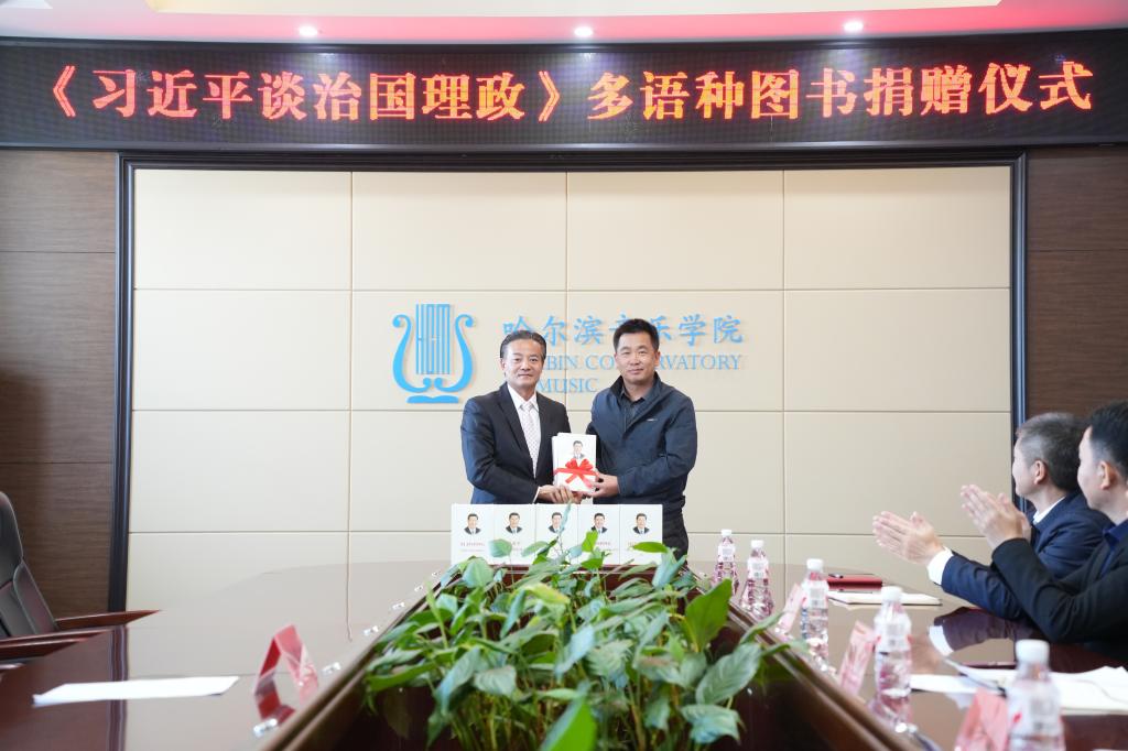 在全国上下学习《习近平谈治国理政》第五卷、举国瞩目的党的二十届四中全会胜利召开之际,北京崇学文化发展有限公司向哈尔滨音乐学院捐赠了涵盖英、法、俄、阿、西、葡、德、日等多语种版本的《习近平谈治国理政》共120册。10月20日,哈尔滨音乐学院举行图书捐赠仪式。学院党委书记雒文虎,北京崇学文化发展有限公司负责人余富文出席仪式,学院党政办公室、组织部、宣传统战部(党委教师工作部)、纪委办公室、马克思主义学院、图书馆等单位负责人参加仪式。捐赠仪式由学院副院长、党委委员宛景森主持。