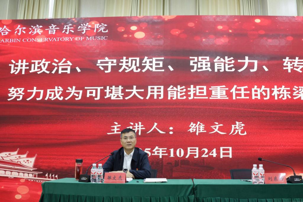 10月24日,哈尔滨音乐学院“讲政治、守规矩、强能力、转作风”年轻干部和业务骨干专题培训班开班。学院党委书记雒文虎出席开班式并讲授开班第一课。学院正副科级干部,各党总支党支部书记、组织员和辅导员,各教学系教研室主任,以及马克思主义学院全体思政课教师参加培训。开班式由学院党委副书记、工会主席刘东兴主持。