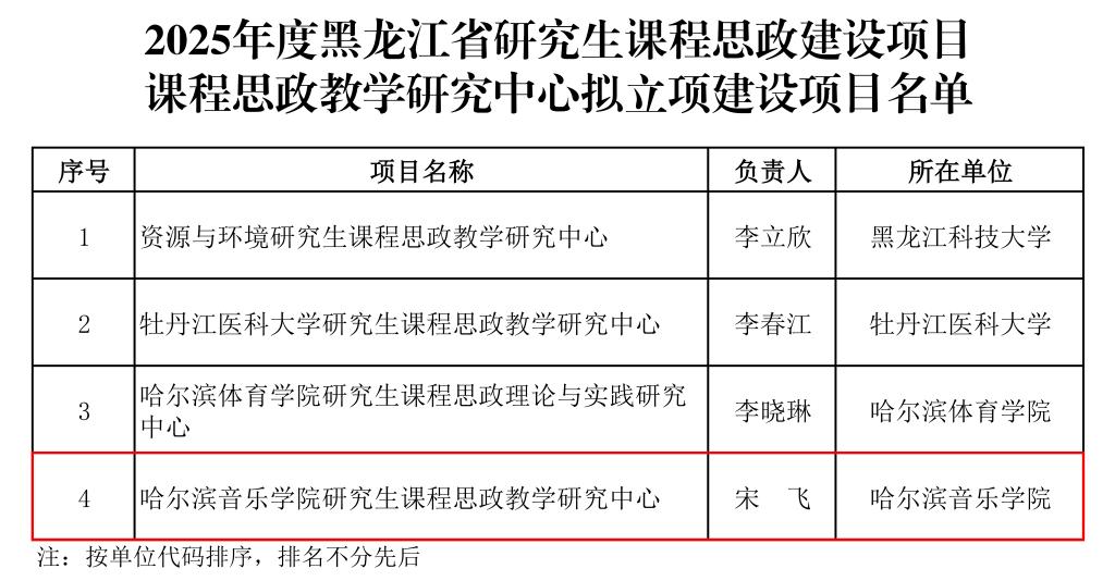 近日,黑龙江省教育厅公布2025年度研究生课程思政建设项目评审结果。学院申报的“哈尔滨音乐学院研究生课程思政教学研究中心”(负责人:宋飞教授)获准立项为省级研究生课程思政教学研究中心,实现学院在该类别项目上的历史性突破;孙中华教授主持的《大型器乐作品分析》课程获批为省级研究生课程思政课程。