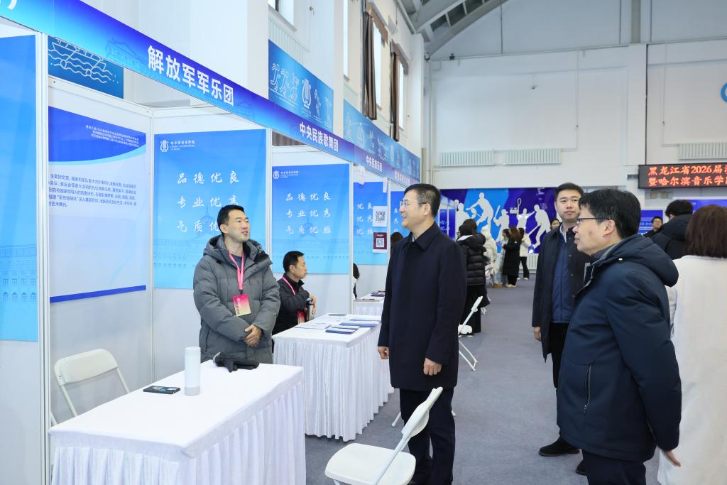 11月29日,由黑龙江省教育厅主办,黑龙江省大学生就业创业指导中心指导,哈尔滨音乐学院承办的黑龙江省2026届涉音乐类毕业生秋季供需见面会暨哈尔滨音乐学院2026届毕业生秋季供需见面会在哈尔滨音乐学院体育馆成功举办。本次供需见面会也是黑龙江省涉音乐类专业高校就业工作协作体成立系列活动之一。黑龙江省教育厅高校学生处处长刘志达、黑龙江省大学生就业创业指导中心主任刘鸿宇到会莅临指导,学院党委书记雒文虎,副院长、党委委员宛景森,副院长、党委委员崔志林出席。来自全国各地的知名专业院团、高等院校及多家企事业单位50余家用人单位齐聚哈音,黑龙江省涉音乐类专业高校就业工作协作体成员高校1000余名师生现场洽谈。