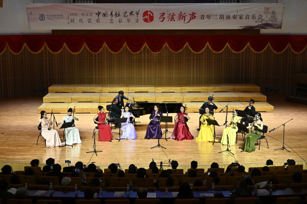 艺术节的舞台星光熠熠,佳作频现。“心弦飞扬”音乐会中,宋飞教授及其博士学生们演绎了从传统经典《河南小曲》到现代狂想《第六二胡狂想曲》的多样作品,展示了扎实传承与锐意创新。“弓弦新声”音乐会上,朱婧、张雯迪、谭欣、刘虹、谢宜含、叶春红、赵元春、马可、杨雪等青年演奏家,演绎了《红梅随想》《塔吉克舞曲》《台北风华》《祁太印象》《楚颂》《乱弹琴声》《风波引》《丝路拾光》等作品,展现了青年一代的卓越技艺与艺术思考,多部作品为首演。“弓弦和鸣”重奏专场,星海音乐学院、沈阳音乐学院、中国音乐学院附中、哈尔滨音乐学院、中央音乐学院、中国音乐学院及天津音乐学院等多所院校的重奏组合轮番登场,《月圆曲》《春郊试马》《乘风》《长城四季—夏》《送我一支玫瑰花》《雨飞舞》《净角的舞台》《弓弦舞》《闲居吟》《戏花鼓》《戏韵三彩》《竞技的秧歌》等作品,展现了胡琴重奏艺术的蓬勃生机与多元风格。“弓弦华章”名家音乐会则将艺术节推向高潮。汝艺的《诗魂》深邃厚重,余乐夫的《踏雨心晴》展现了岭南风韵与现代情怀,梁云江携哈尔滨音乐学院师生演绎的《江河云梦》气势磅礴,苏雅的四胡独奏《莽古斯》雄浑奇崛,邓建栋改编并演奏的《云裳诉》凄美婉转,高韶青的《随想曲第六号——韶音》充满科幻与哲思,姜克美的板胡《稻香丰年》热烈欢腾,最后,院长宋飞与哈尔滨音乐学院青年民族乐团在指挥家孙敬凯执棒下,震撼首演了充满黑土地情怀的《狂想曲·黑土》,为艺术节画上圆满句号。