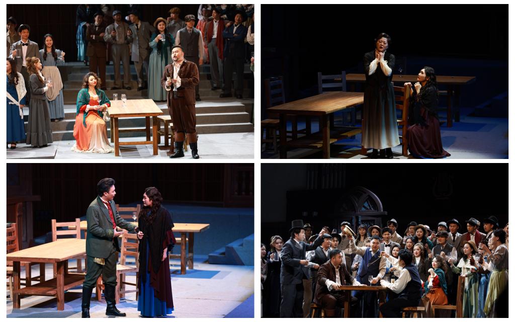 《乡村骑士》以19世纪意大利南部乡村生活为背景,通过激烈的情感冲突,展现了社会现实与人性深度。演出既忠实于原作的真实主义内核,又融入了当代审美表达,通过紧凑的节奏把控与强烈的戏剧冲突设计,让这部百年经典焕发出新的艺术活力。演出中,合唱队与钢琴的默契配合更是亮点纷呈,恢宏的合唱段落与优雅的钢琴音调相得益彰,完美呈现了作品兼具抒情性与戏剧性的音乐特色。