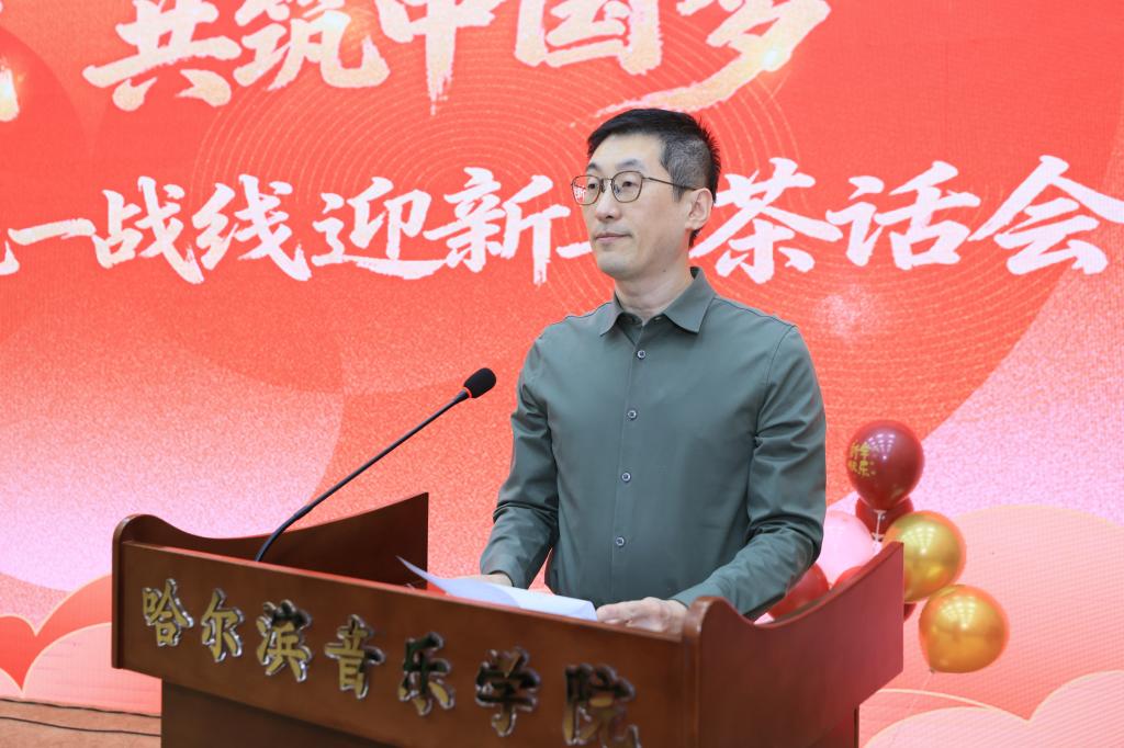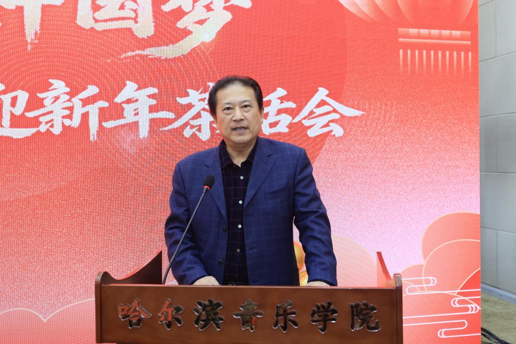 学院党委书记雒文虎在讲话中代表学院党委向全体统战成员致以新年祝福。他回顾了2025年学院统战工作取得的显著成绩:在思想引领方面,持续深化统战政策理论学习,加强党外干部培养使用;在民族团结方面,成功获批“黑龙江省高校铸牢中华民族共同体意识教育实践基地”,多项活动得到国家民委肯定;在服务发展方面,统战成员围绕龙江振兴深入调研献策,推动学院与省市部门建立常态化对接机制,为“音乐之城”建设贡献智慧力量。