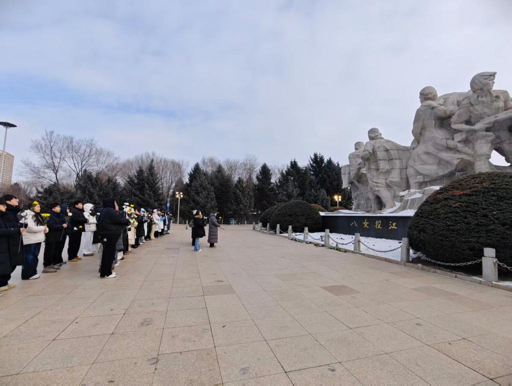 1月25日,演出师生到达《霜晨月》“八位抗联女英雄”故里——牡丹江后,随即来到“八女投江”烈士群雕纪念广场开展敬英烈、沐英魂的“党建+采风”活动,将烽火岁月中的不屈信念转化为歌剧的艺术细节。这种“沉浸式”的红色教育,让“中华民族共同体意识”从抽象概念变为可感可知的艺术表达,也让参演师生在创排过程中接受了入脑入心的思政教育,实现“以艺传情、以文化人、以美育人”的育人初心。