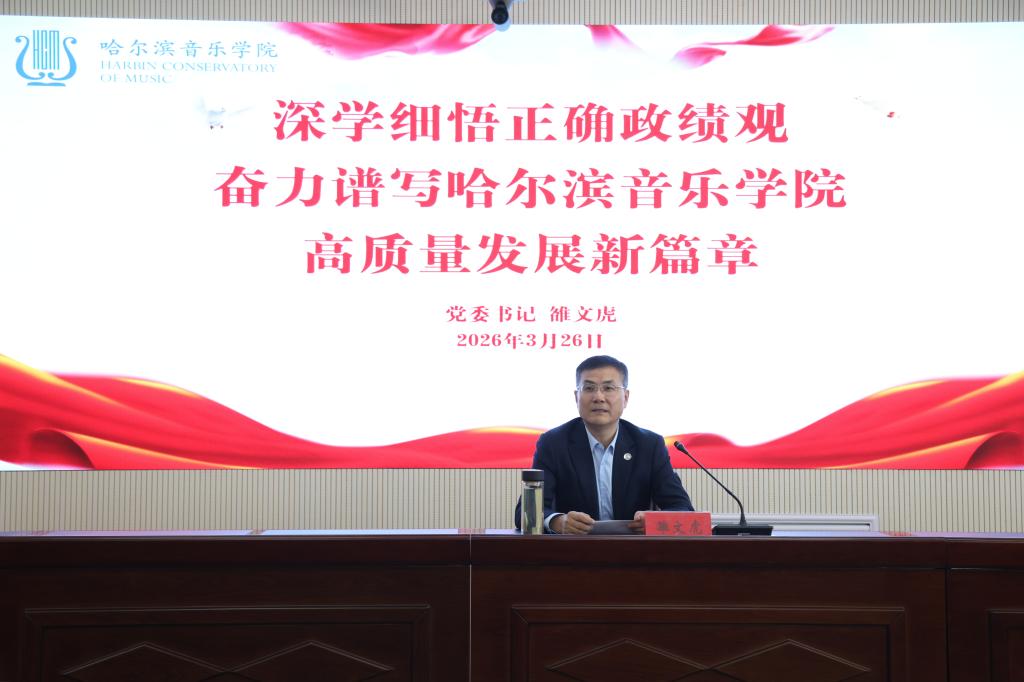 随后,雒文虎以“深学细悟正确政绩观 奋力谱写哈尔滨音乐学院高质量发展新篇章”为题作首场辅导报告,从深刻把握正确政绩观的核心要义和时代内涵、清醒认识学院发展中政绩观方面存在的突出问题、以正确政绩观引领学院高质量发展的实践路径三个维度,进行了全面系统地阐释。他解读了正确政绩观的理论根基、实践要求,深刻回答了政绩观“三个根本性问题”,同时,雒文虎对照中央及省委要求、学院发展需要与师生期盼,分析了学院在工作实效、改革创新等方面的可提升空间,为后续细化改进举措、提升工作质效指明方向。