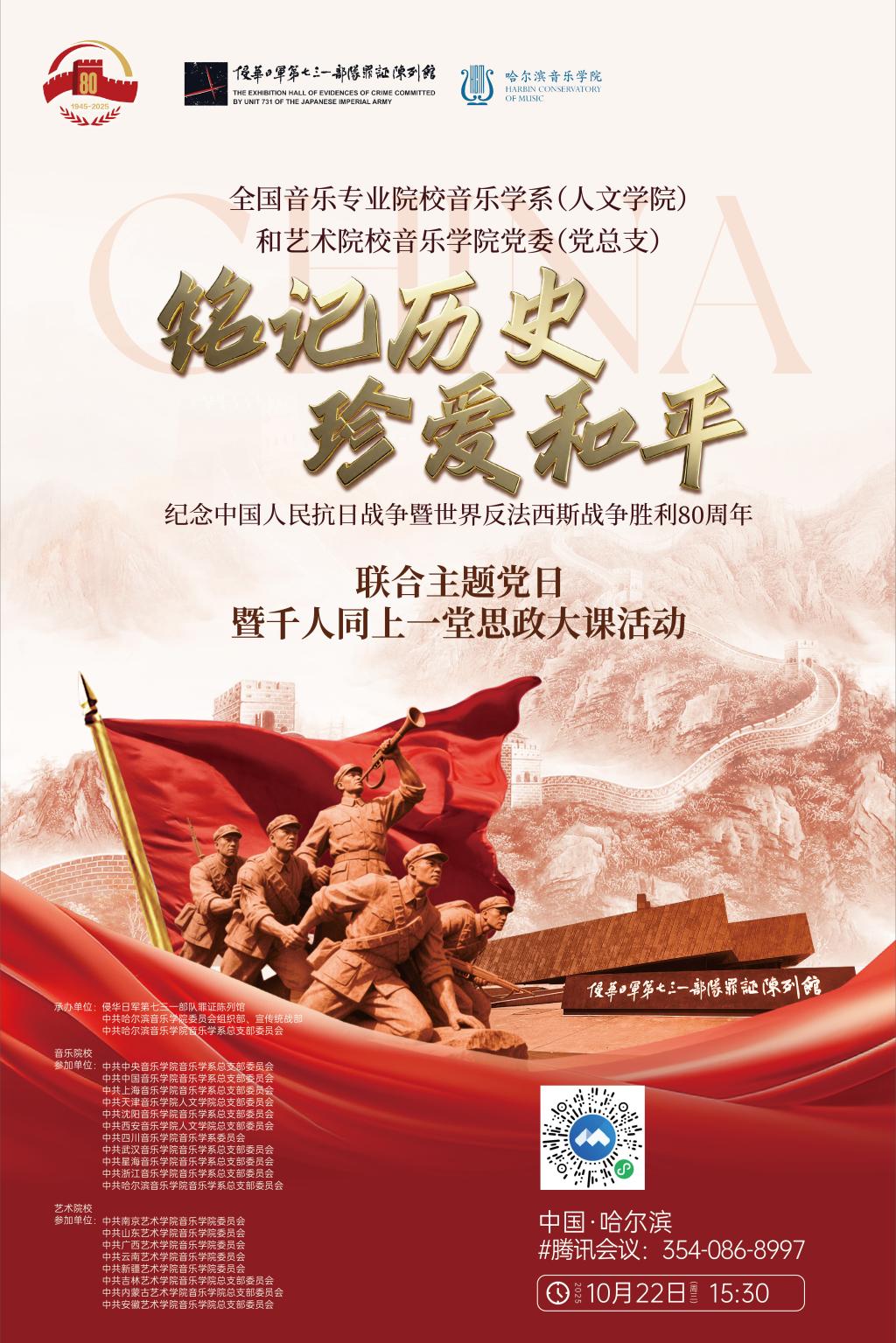 为深入学习贯彻习近平总书记在纪念中国人民抗日战争暨世界反法西斯战争胜利80周年活动上的重要讲话精神,10月22日下午,由哈尔滨音乐学院组织部、宣传统战部(党委教师工作部)、音乐学系党总支及侵华日军第七三一部队罪证陈列馆联合承办的“铭记历史、珍爱和平”纪念中国人民抗日战争暨世界反法西斯战争胜利80周年联合主题党日暨千人同上一堂思政大课活动在哈尔滨举行。活动以探索构建音乐艺术院校党建和思想政治工作论坛为依托,吸引了来自全国11所独立设置的音乐学院音乐学系(人文学院)和8所公办本科艺术学院音乐学院党委(党总支)的千余名党员和师生通过线上线下相结合的方式参与活动。