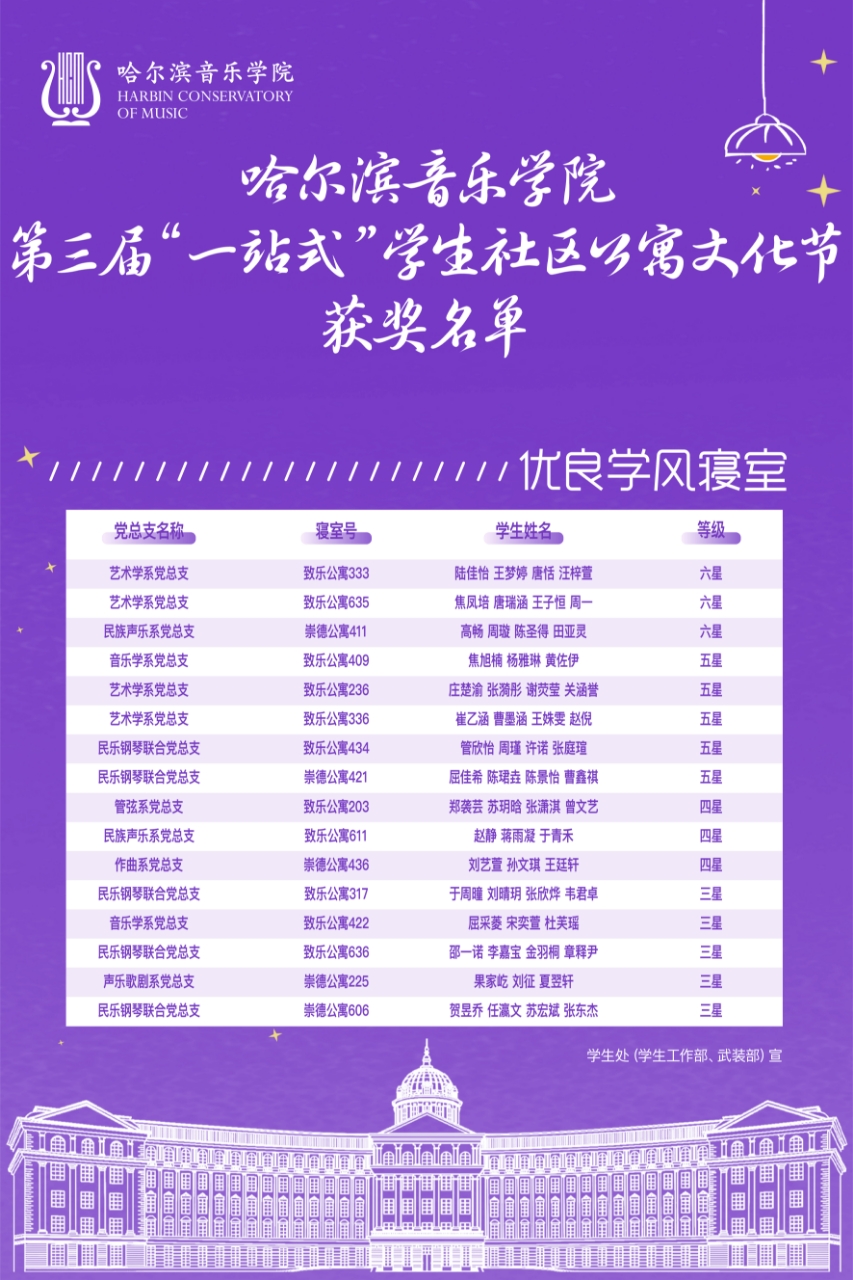 以学风铸魂,以互助赋能。在哈尔滨音乐学院第三届“一站式”学生社区公寓文化节中,“优良学风寝室”评选作为“知行行动”的核心载体,将育人阵地从课堂延伸至社区,吸引了全院寝室积极参与。经过严格评审,最终3个六星、5个五星寝室、3个四星寝室、5个三星寝室,共16间寝室凭借其卓越的集体学风与共进精神,获评此项荣誉。它们用行动证明,寝室不仅是生活的港湾,更是学风建设的最小单元和最优土壤。