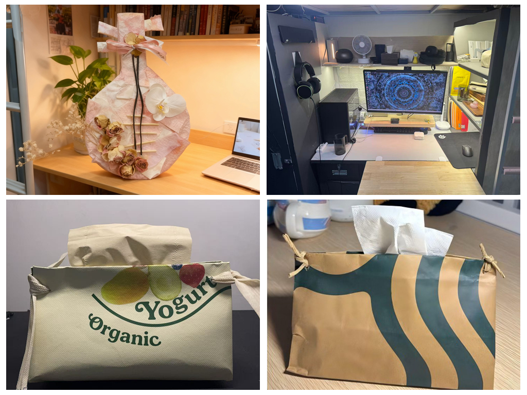 在众多优秀作品中,同学们展现出卓越的创意能力和动手能力。民族声乐系2025级本科生厉瑶将日常废弃的奶茶纸袋改造为实用抽纸盒,通过精准裁剪和隐形粘合,既保留了原材料的质感特色,又实现了功能的完美转化。“环保不是口号,而是融入细节的行动。”厉瑶在分享创作心得时表示。