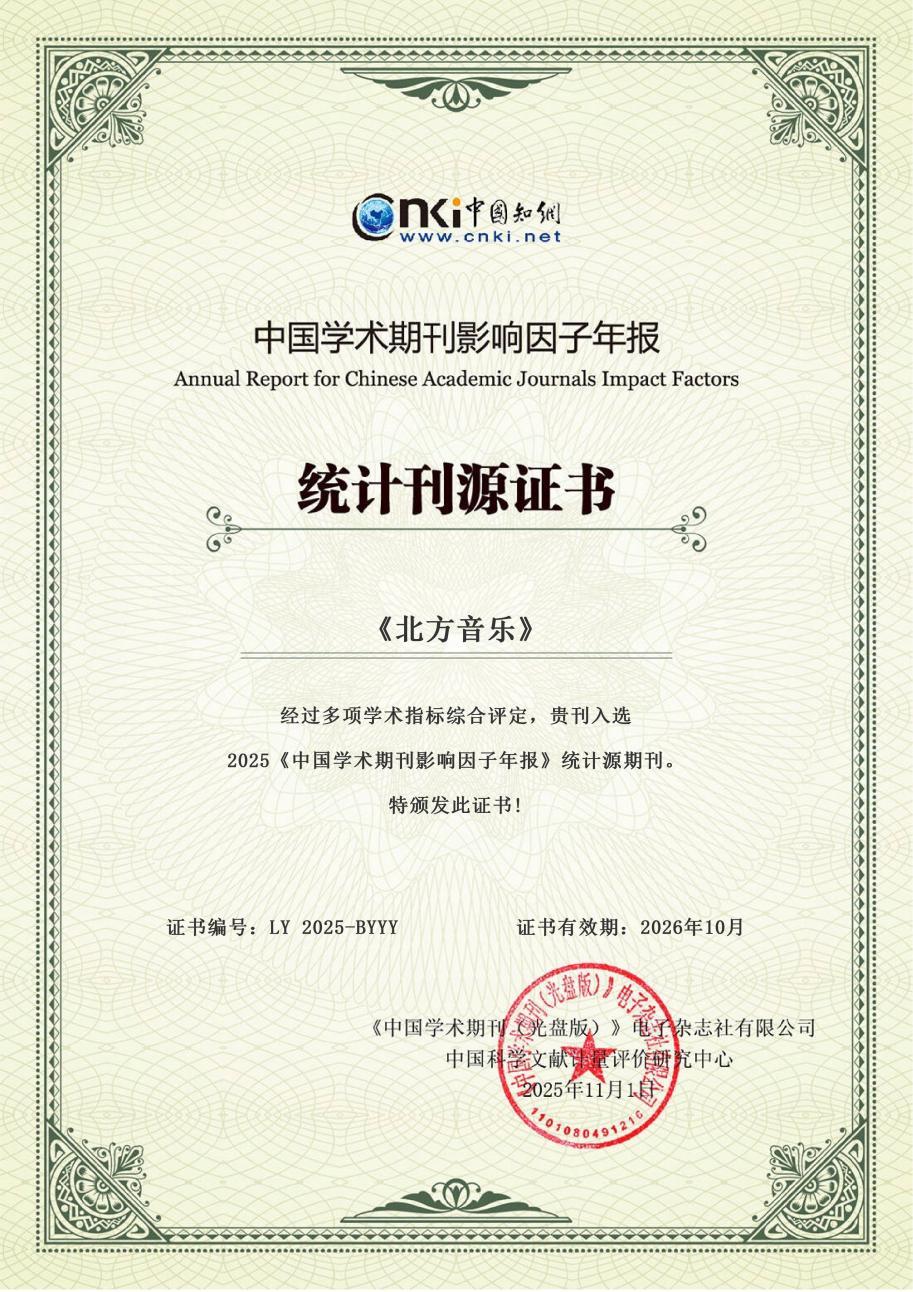 近日,《中国学术期刊影响因子年报(人文社会科学·2025版)》发布,《北方音乐》于本年度首次入选该年报统计源期刊,跻身Q2区,在全国专业音乐学院学报中排名第6位,期刊学术影响力持续提升。