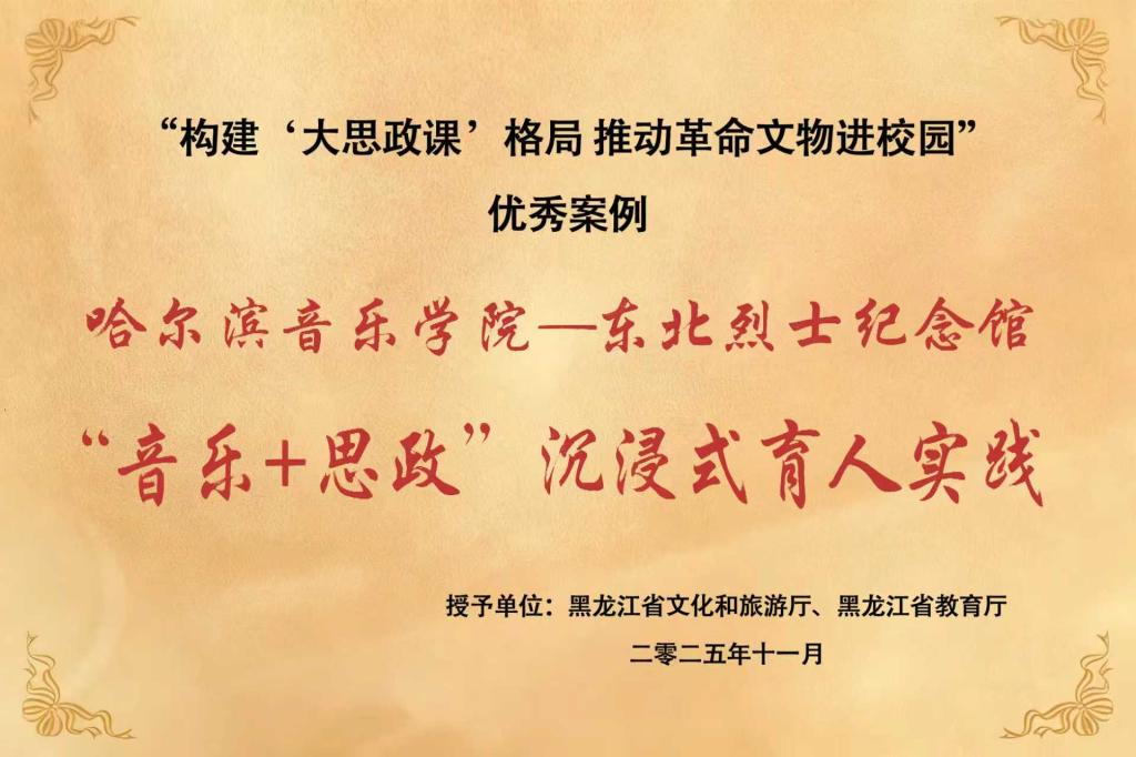 近日,黑龙江省文化和旅游厅、省教育厅联合公布“构建‘大思政课’格局推动革命文物进校园”优秀案例评选结果,我院申报的《哈尔滨音乐学院“音乐+思政”沉浸式育人实践》凭借其独特的育人理念和创新的实践路径,在全省众多案例中脱颖而出,荣获“十佳优秀案例”。这一荣誉是对学院积极探索“大思政课”育人新路径、推动革命文物与艺术教育深度融合的充分肯定,彰显了学院在红色文化传承与思政教育创新中的示范引领作用。