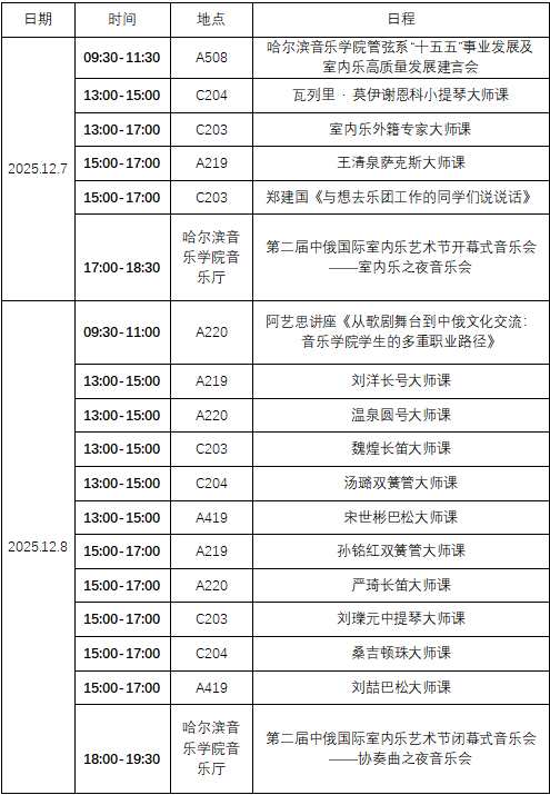哈尔滨音乐学院“中俄国际室内乐艺术节”是学院着力打造的知名品牌项目。自该艺术节首届举办以来,受到国内外诸多知名音乐专家和学者的关注,国内外著名院校的艺术家受邀参与艺术节演出、讲座。此次艺术节将为大家呈现2场音乐会,14场公开大师课,2场专家讲座,带领冰城音乐以全球化的视野,从实践、教学、研讨等维度,全方位的畅游室内乐领域,彰显冰城哈尔滨在管弦室内乐发展的无限活力,管弦和鸣、美美与共,共谱中俄音乐华章。