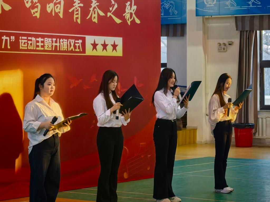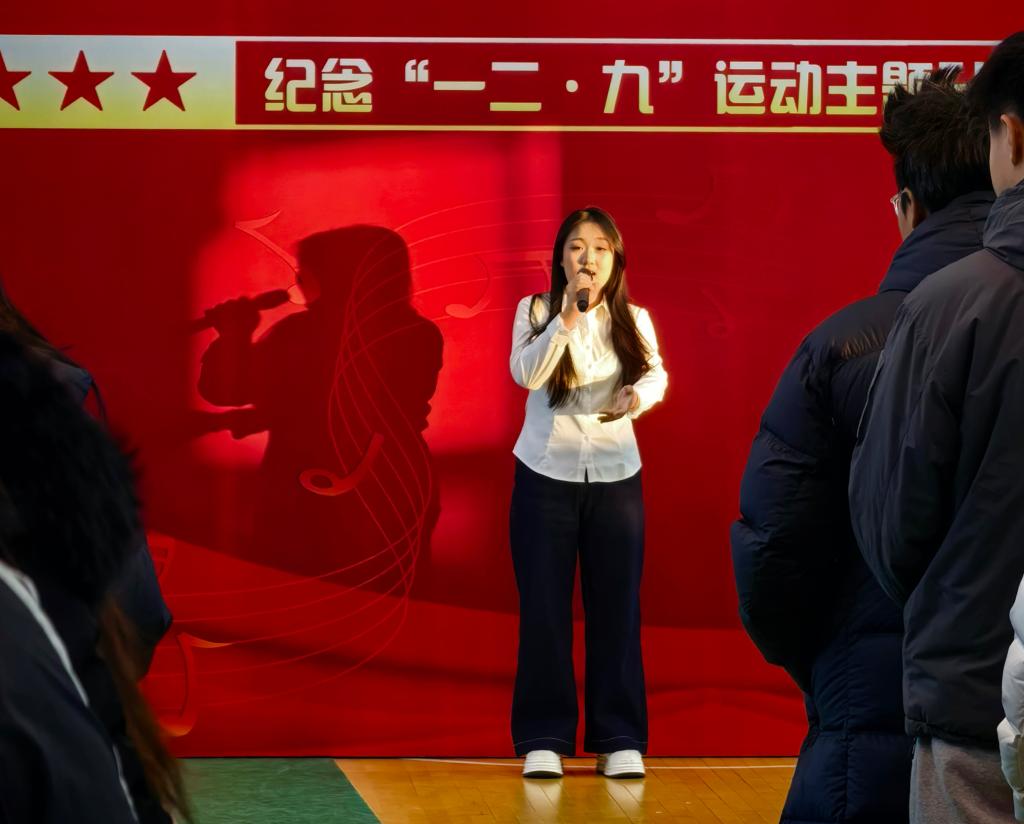伴随着庄严的《义勇军进行曲》,全体人员肃立行注目礼,鲜艳的五星红旗在注目下冉冉升起。师生高唱国歌,在激昂的旋律中共同追忆“一二·九”运动中青年学子的爱国壮举,激发新时代青年的责任担当。