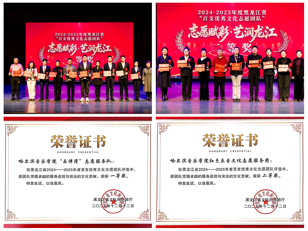近日,黑龙江省文化和旅游厅联合省委社会工作部、省教育厅发起的2024-2025年度优秀文化志愿服务团队表彰大会在黑龙江艺术职业学院剧场举行,学院团委“乐伴湾”志愿服务队、声乐歌剧系红色乐音文化志愿服务团分别荣获一等奖、二等奖。