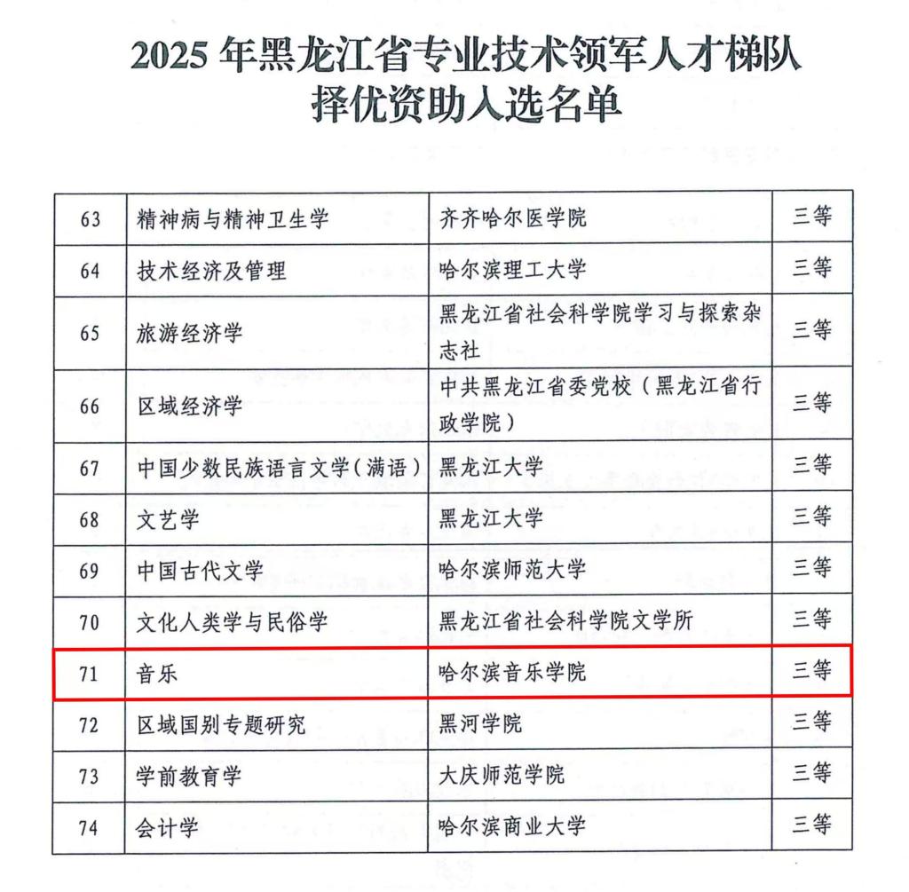近日,省人力资源与社会保障厅公布《2025年黑龙江省专业技术领军人才梯队择优资助入选名单》,我院以院长宋飞为带头人的音乐梯队获批省级专业技术领军人才梯队资助,获批等级为三等资助。我院音乐梯队是我省优化建设专业技术领军人才梯队后,首次获批省级专业技术领军人才梯队资助的梯队,同时也是我省唯一获批资助的音乐艺术类梯队,是对我院学科建设成果的高度认可。