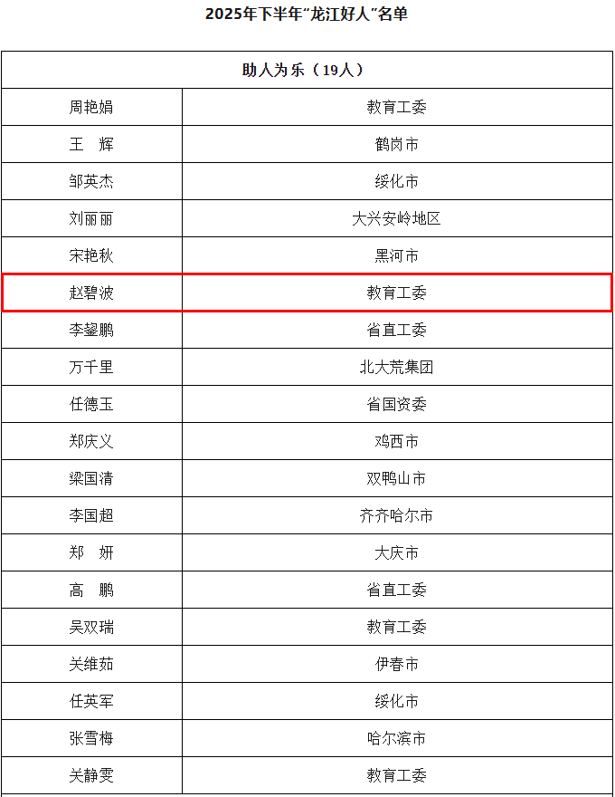 近日,黑龙江省文明办公布2025年下半年“龙江好人”名单。经各地各系统推荐、资格审查、负面核查、网络评议、专家评审等环节,学院教师赵碧波入选“助人为乐”名单。