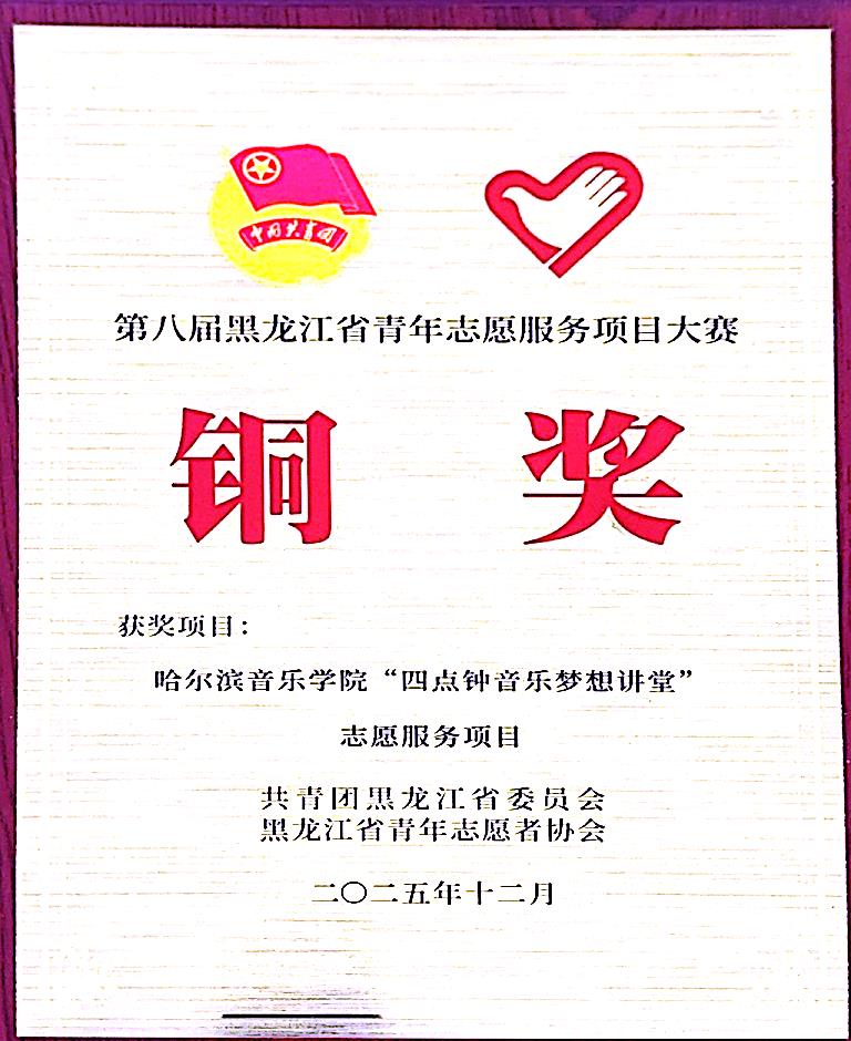 近日,由共青团黑龙江省委员会、黑龙江省青年志愿者协会主办的第八届黑龙江省青年志愿服务项目大赛暨2025年志愿服务交流会圆满落幕。哈尔滨音乐学院在此次大赛中表现突出,共获得金奖1项、铜奖1项和优秀奖1项,展现了学院在志愿服务领域的积极作为和育人成效。