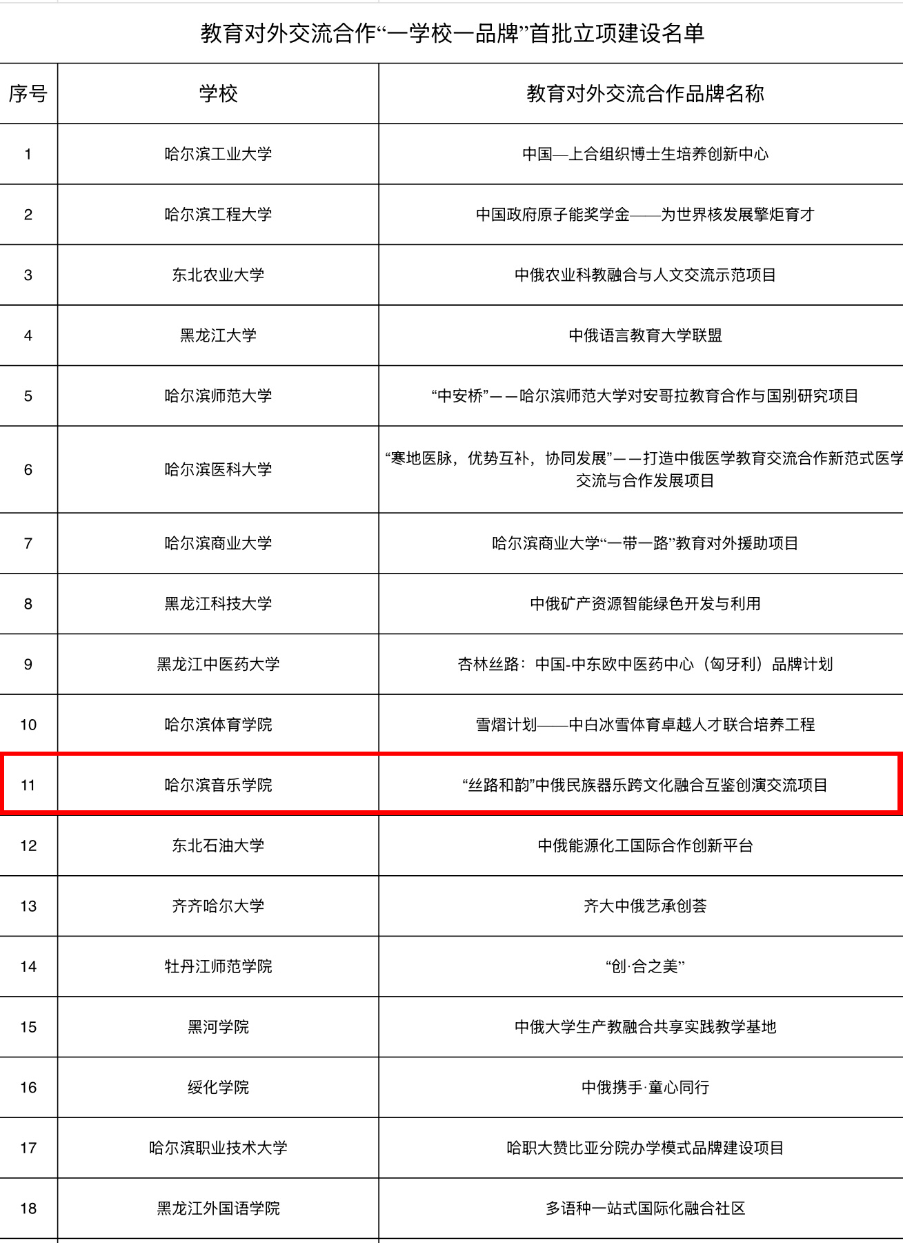 近日,黑龙江省教育厅发布《关于教育对外交流合作“一学校一品牌”首批立项建设的通知》,公布了黑龙江省对外交流合作“一学校一品牌”首批立项名单。学院院长宋飞教授作为首席艺术家主持的、以哈音民乐系青年民族乐团为主体的《“丝路和韵”中俄民族器乐跨文化融合互鉴创演交流项目》成功入选。该项目是全省首批20个项目中唯一一项音乐类项目。