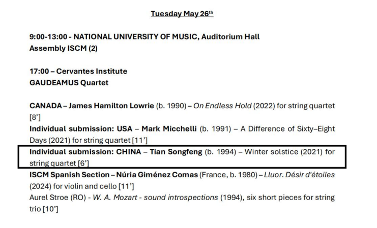 近日,我校作曲系讲师、硕士研究生导师、在站博士后田淞丰博士的弦乐四重奏作品《冬至》(Winter Solstice)成功入选2026年国际现代音乐协会(ISCM)世界新音乐节,将在罗马尼亚举办的音乐节期间演出。