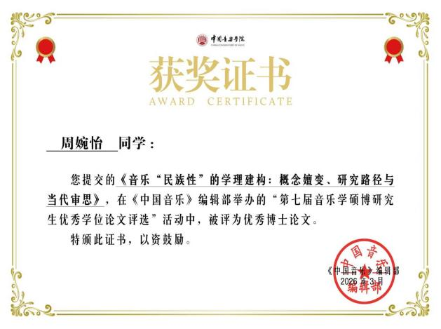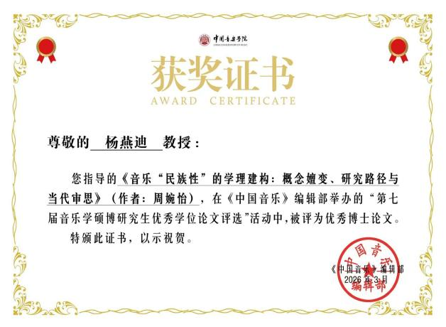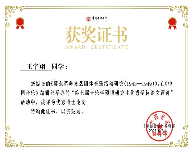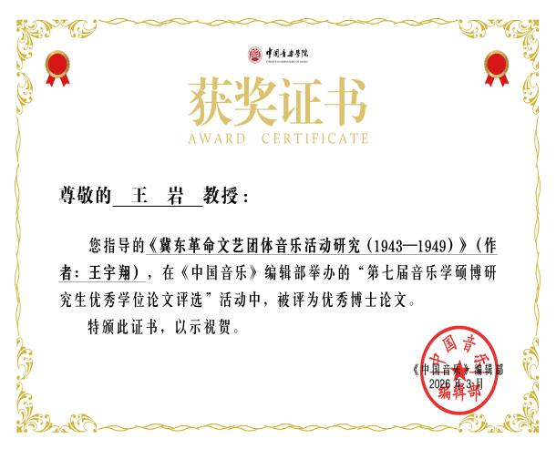近日,《中国音乐》第七届音乐学硕博研究生优秀学位论文评选结果正式揭晓,我校研究生培养工作再添硕果。2025届博士毕业生周婉怡的《音乐“民族性”的学理构建:概念、研究路径与当代审思》(指导教师:杨燕迪教授)与王宇翔的《冀东革命文艺团体音乐活动研究(1943-1949)》(指导教师:王岩教授),分别获得民族音乐学与传统音乐理论方向和中国音乐史学方向“优秀博士论文”奖。
