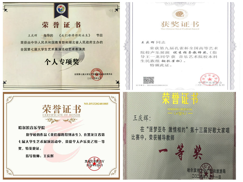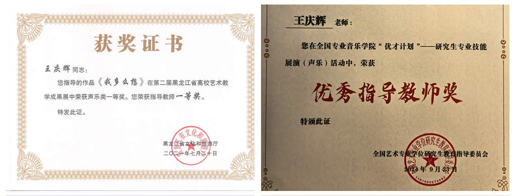 执教以来,王庆辉同志充分发挥自身优势,因材施教,注重学生艺德与能力的双重培育。她所培养的学生累计荣获国家级、省部级、校级奖项200余项,包括国家奖学金、优秀毕业生、省级三好学生、亚冬会志愿服务省级嘉许等荣誉。在专业赛事中,其指导的20余名学生先后在韩国春川国际声乐比赛、全国大学生艺术展演、“孔雀杯”“中国声乐小金钟奖”等国内外赛事中斩获佳绩。