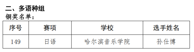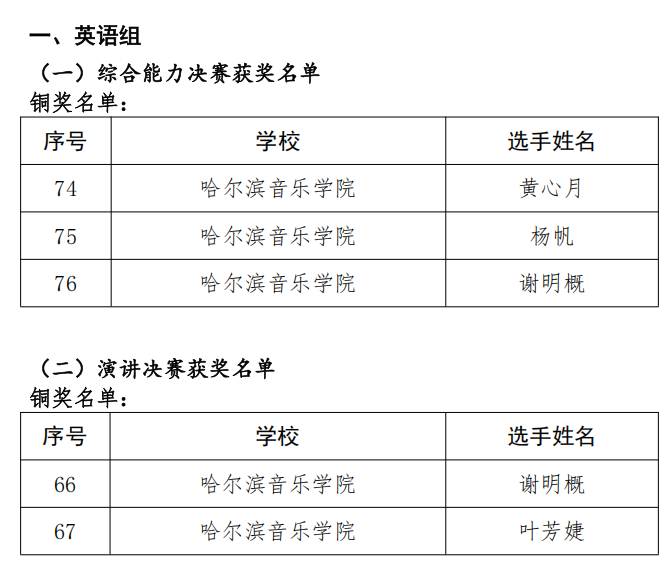 近日,黑龙江省教育厅公布了2025年“外研社·国才杯”“理解当代中国”全国外语能力大赛黑龙江省赛区获奖结果。学院学生在比赛中再创佳绩,共有6人次在黑龙江省赛区决赛中获得佳绩。其中,音乐学系2024级硕士生黄心月、谢明概、钢琴系2022级本科生杨帆获得省赛英语组综合能力决赛铜奖,音乐学系2024级硕士生谢明概、叶芳婕获得省赛英语组演讲决赛铜奖;音乐学系2024级硕士生孙仕博获得省赛多语种组日语决赛铜奖,在多语种组比赛获奖中取得了零的突破。