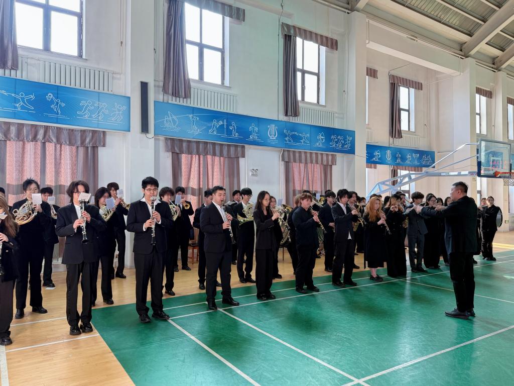 学院管乐团倾情演奏经典曲目《走向复兴》,悠扬奋进的旋律在体育馆内回荡,充分展现出哈音学子昂扬向上、锐意进取的精神风貌,点燃了全场师生的爱国热情与民族自豪感。