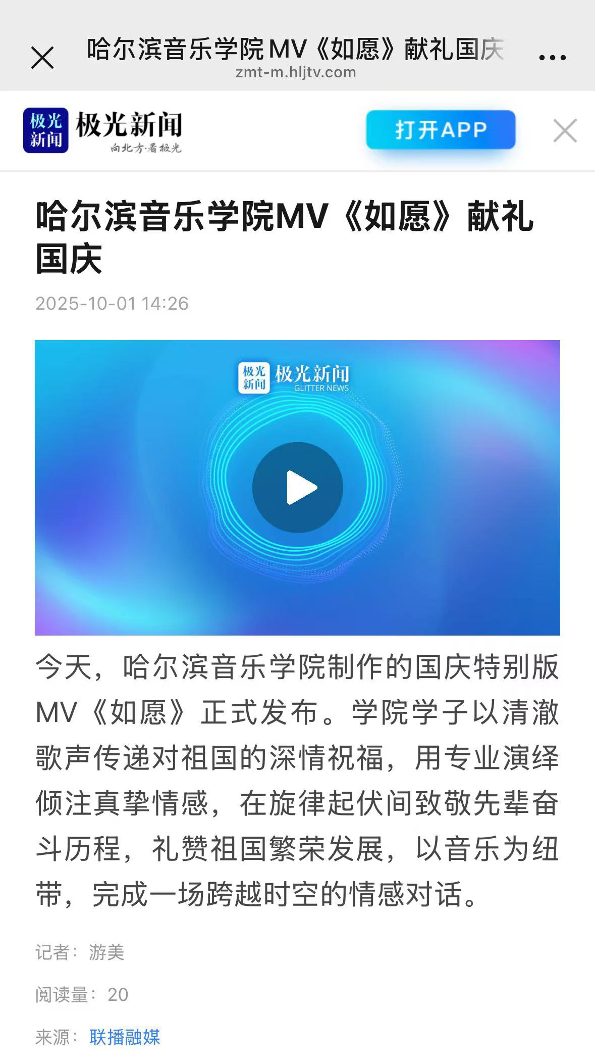上一条:黑龙江网:哈尔滨音乐学院国庆特别版MV《如愿》以清澈歌声传递对祖国的深情祝福