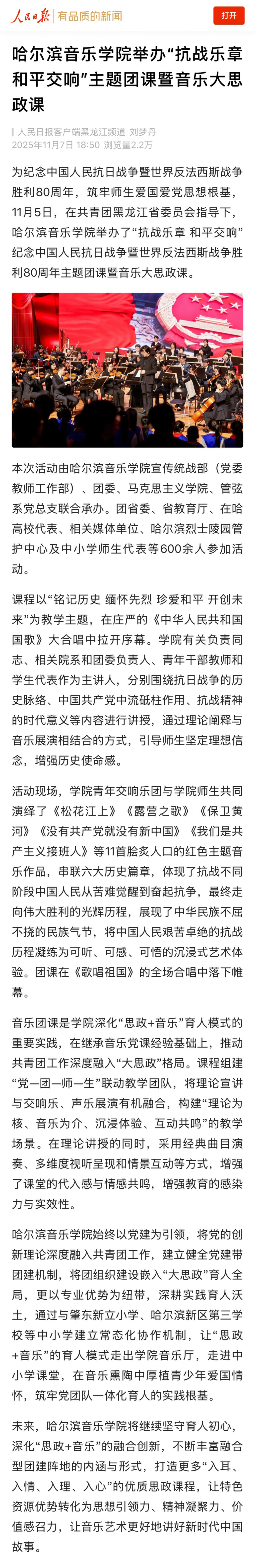 下一条:龙头新闻:哈尔滨音乐学院举办“抗战乐章 和平交响”主题团课暨音乐大思政课