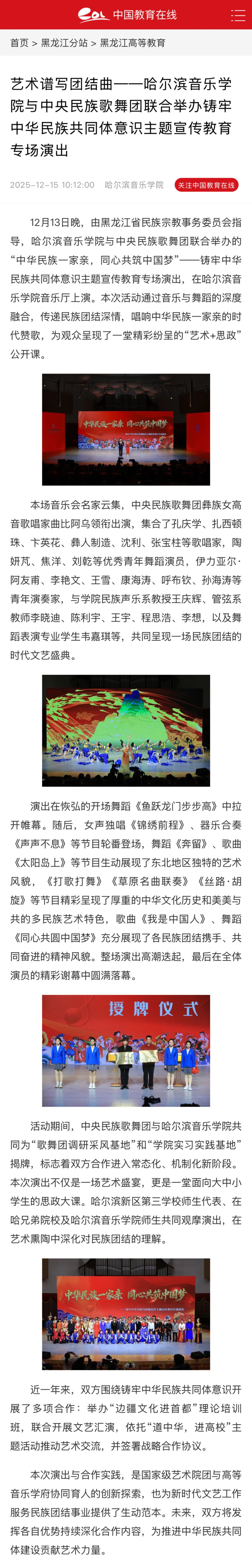 上一条:人民日报:哈尔滨音乐学院与中央民族歌舞团联合举办铸牢中华民族共同体意识主题宣传教育专场演出